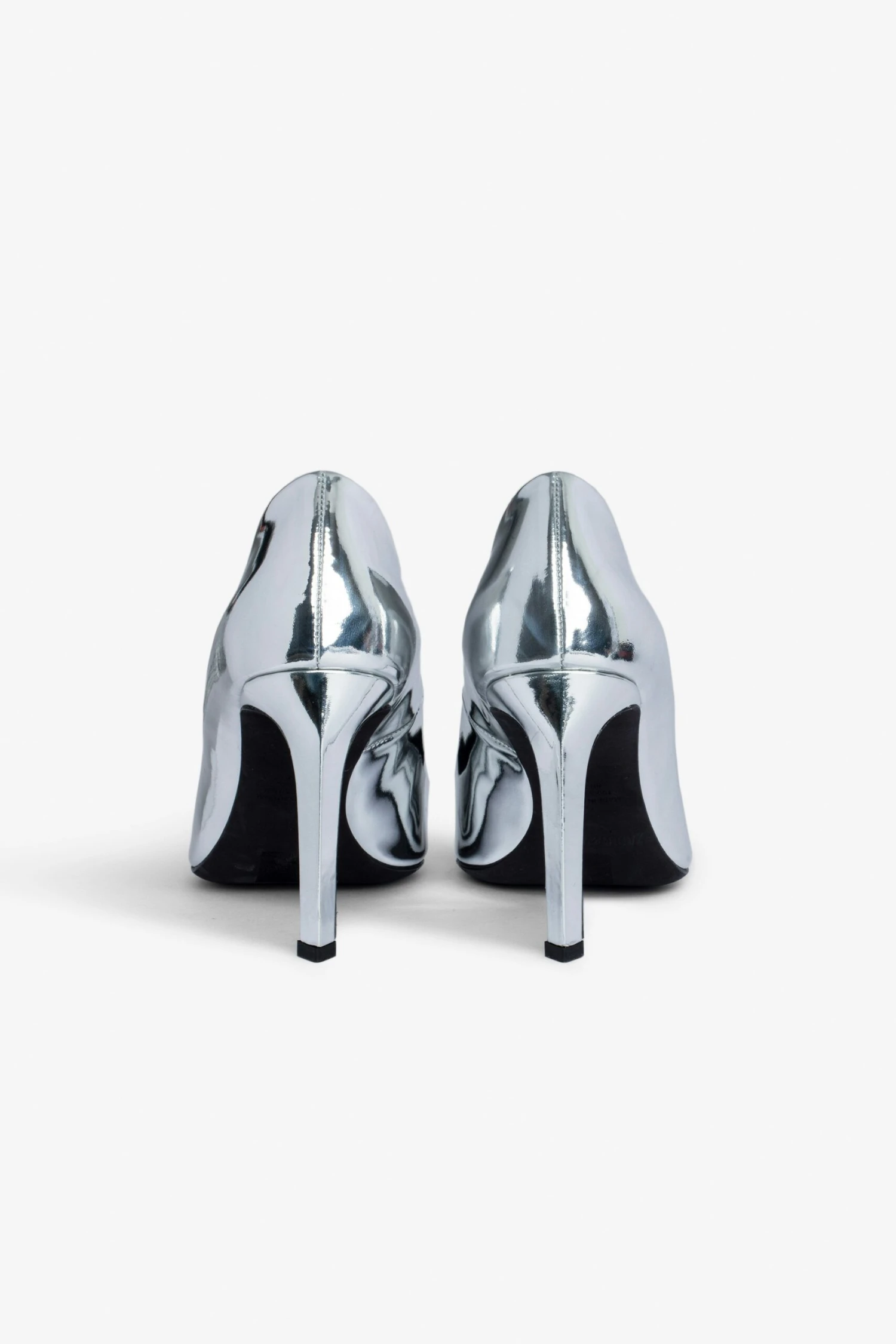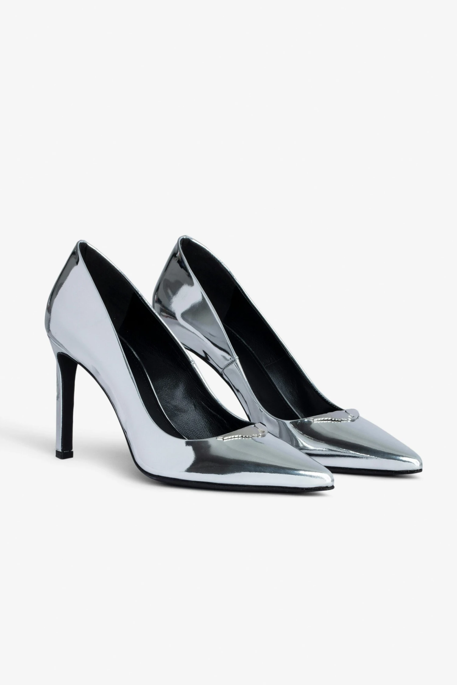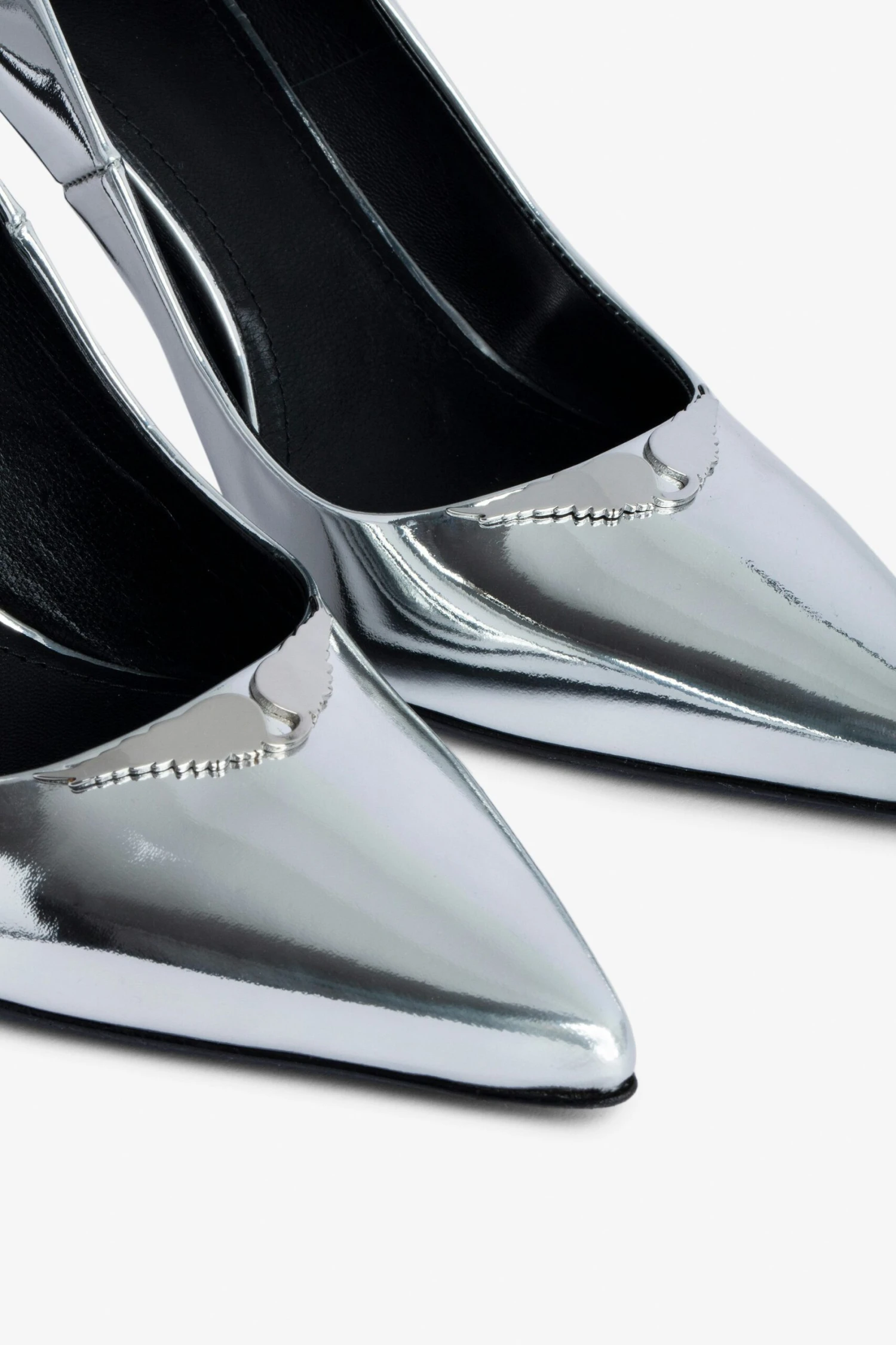 Silver patent leather court shoes with mirror wings charm.