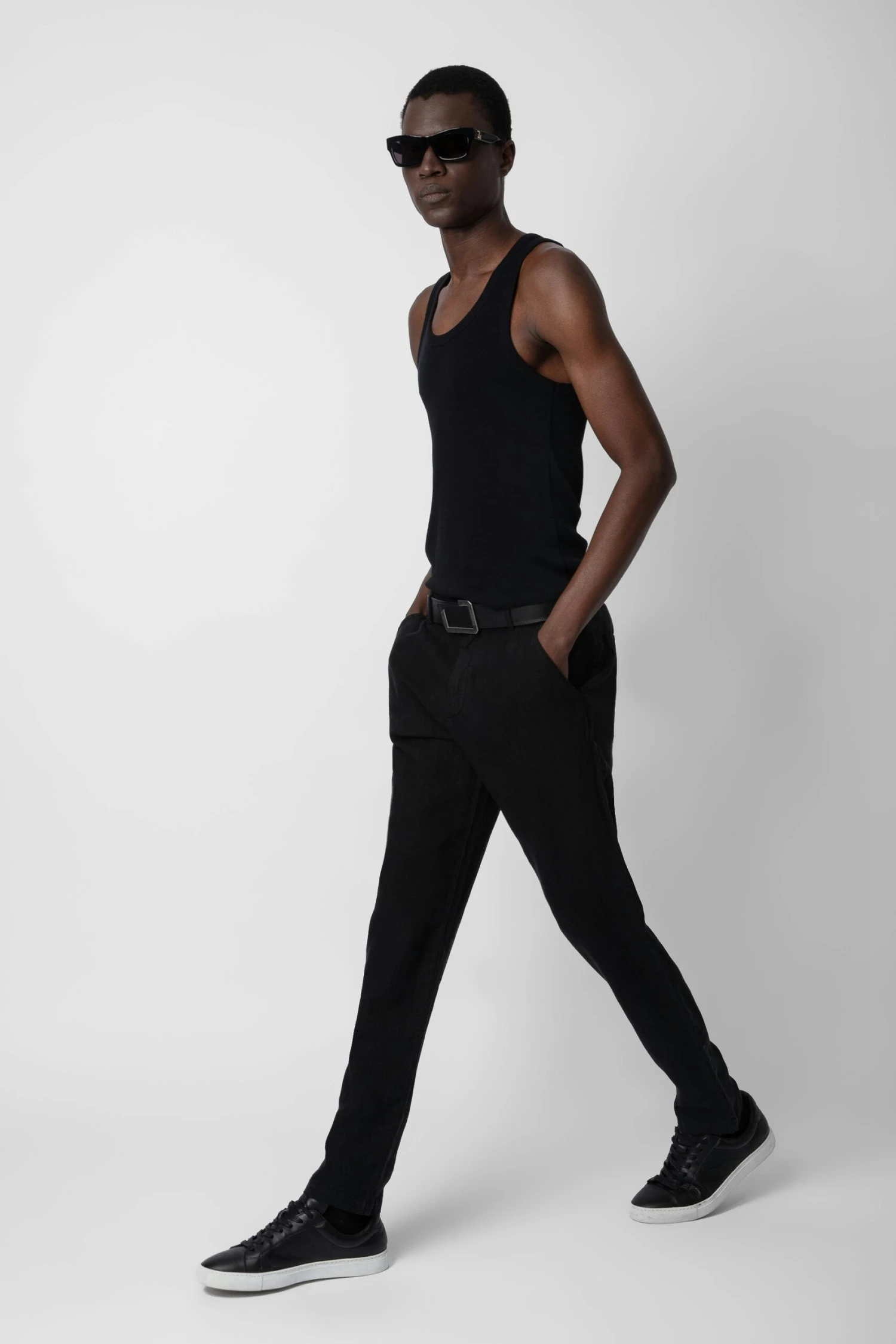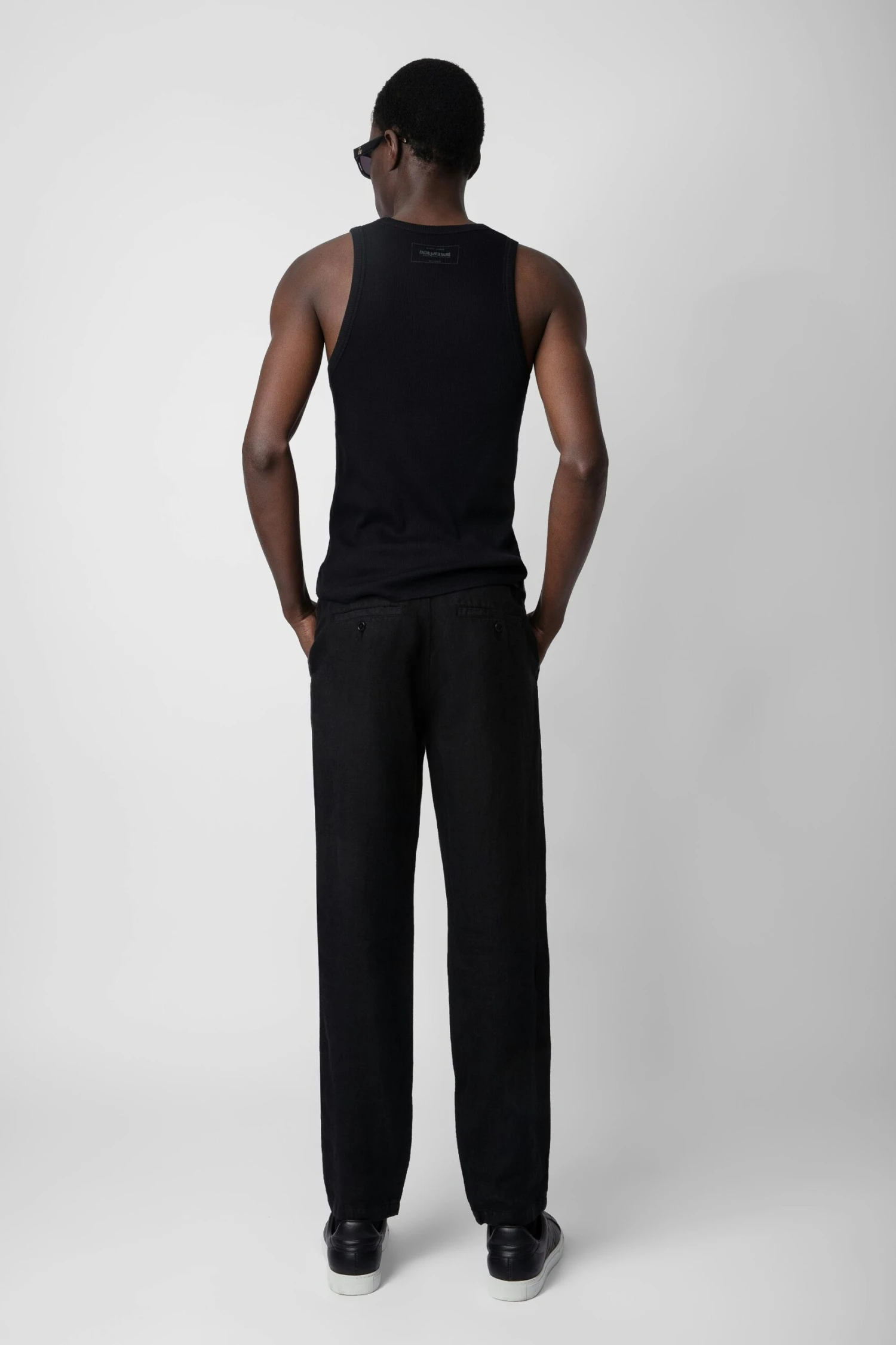 – Men’s black washed linen structured straight-cut pants – Zip and button fly and belt loops at the waist – 2 side pockets, 2 buttoned piped pockets and ZV signature on the back – Made in Portugal Model is 186 cm / 6′ 1″ and is wearing a size 38