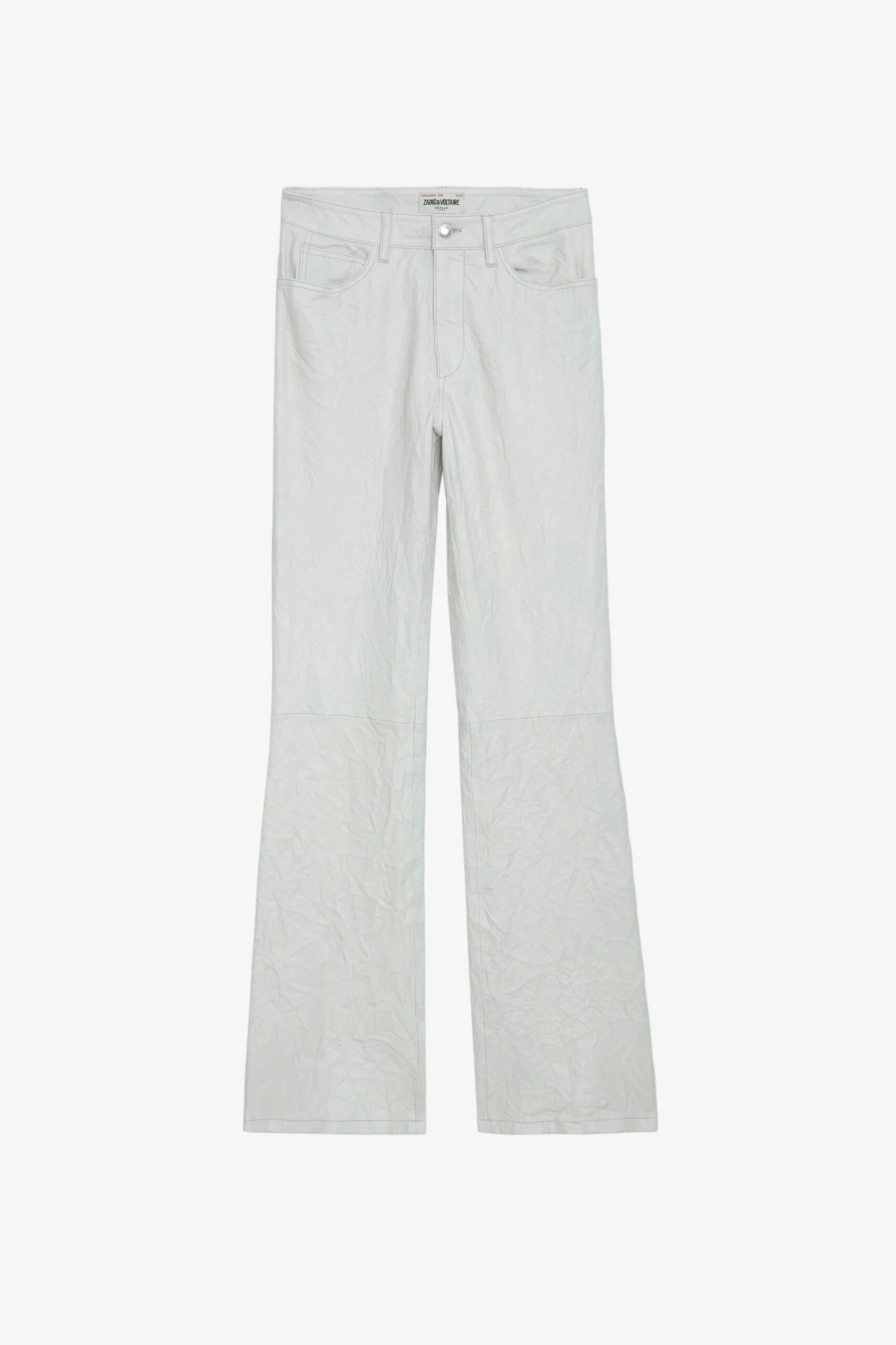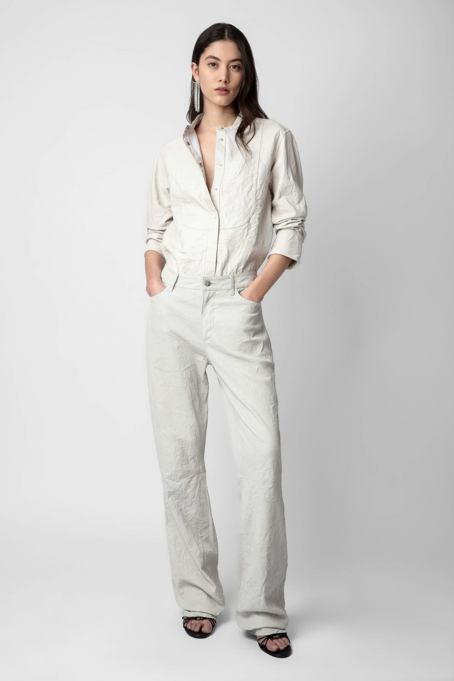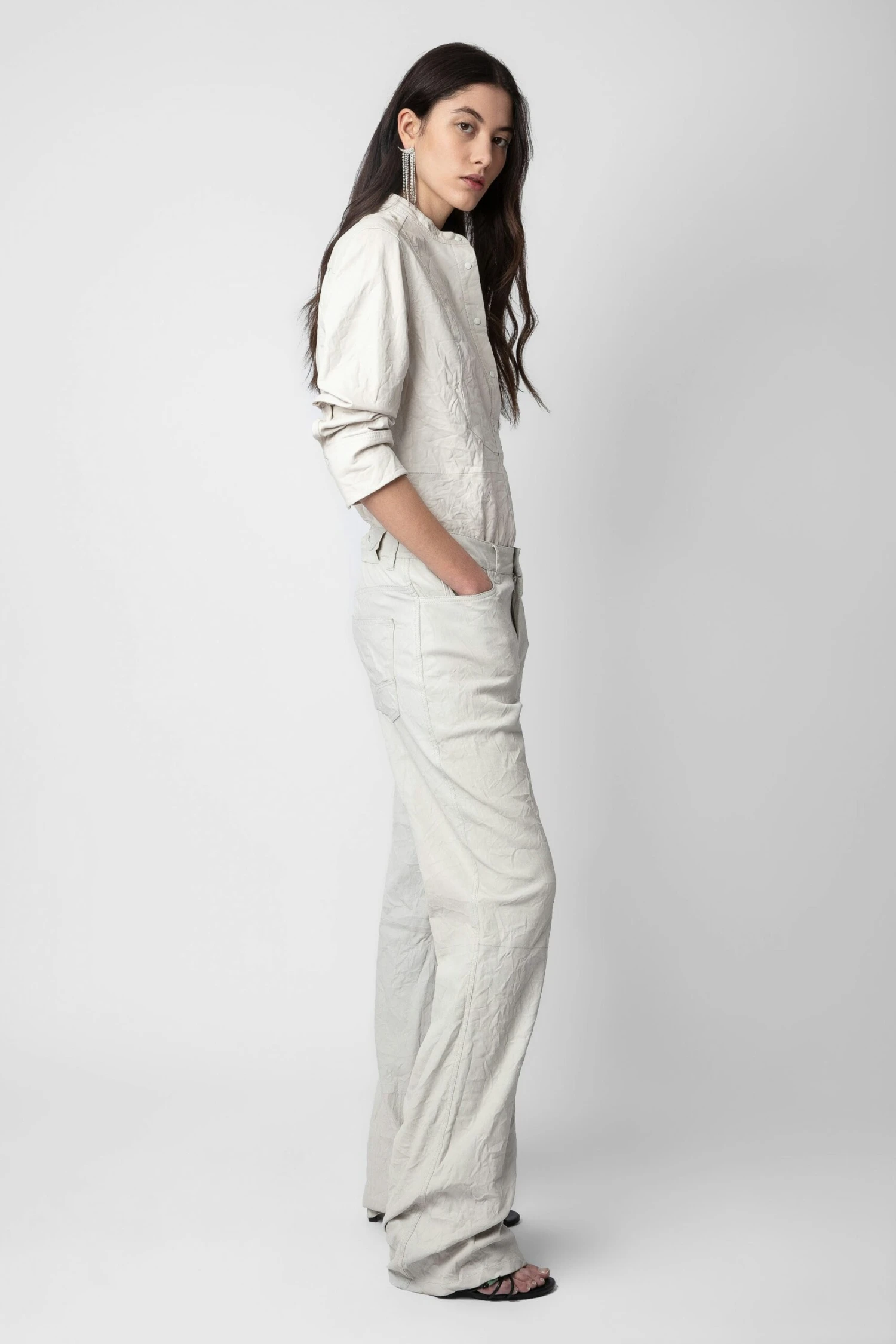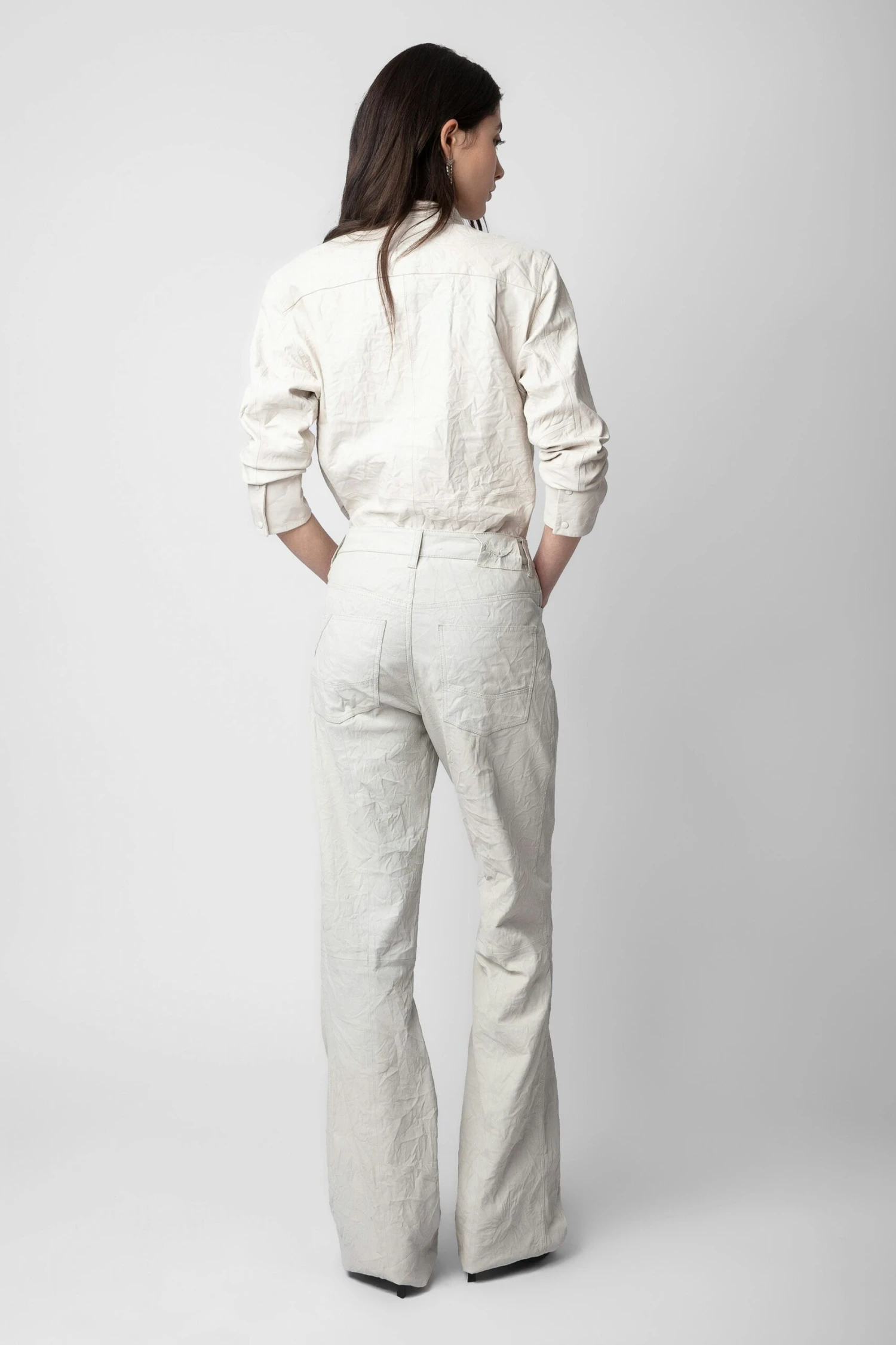 – Women’s Judo white flared tailored pants in crinkled leather – Lengthwise pleats – High wasisted – 5 pockets, belt loops at the waist and tone-on-tone jacron with wings – An iconic Zadig&Voltaire material, leather is crumpled in several stages designed by the brand, guaranteeing a unique product made with expertise. Model is 178 cm / 5′ 10″ and is wearing a size SThe Leather Working Group/LWG is a membership organization comprised of brands, suppliers, leather manufacturers and other stakeholders within the leather manufacturing industry. The group has developed an auditing program which certifies leather manufacturing facilities based on their environmental compliance and performance capabilities