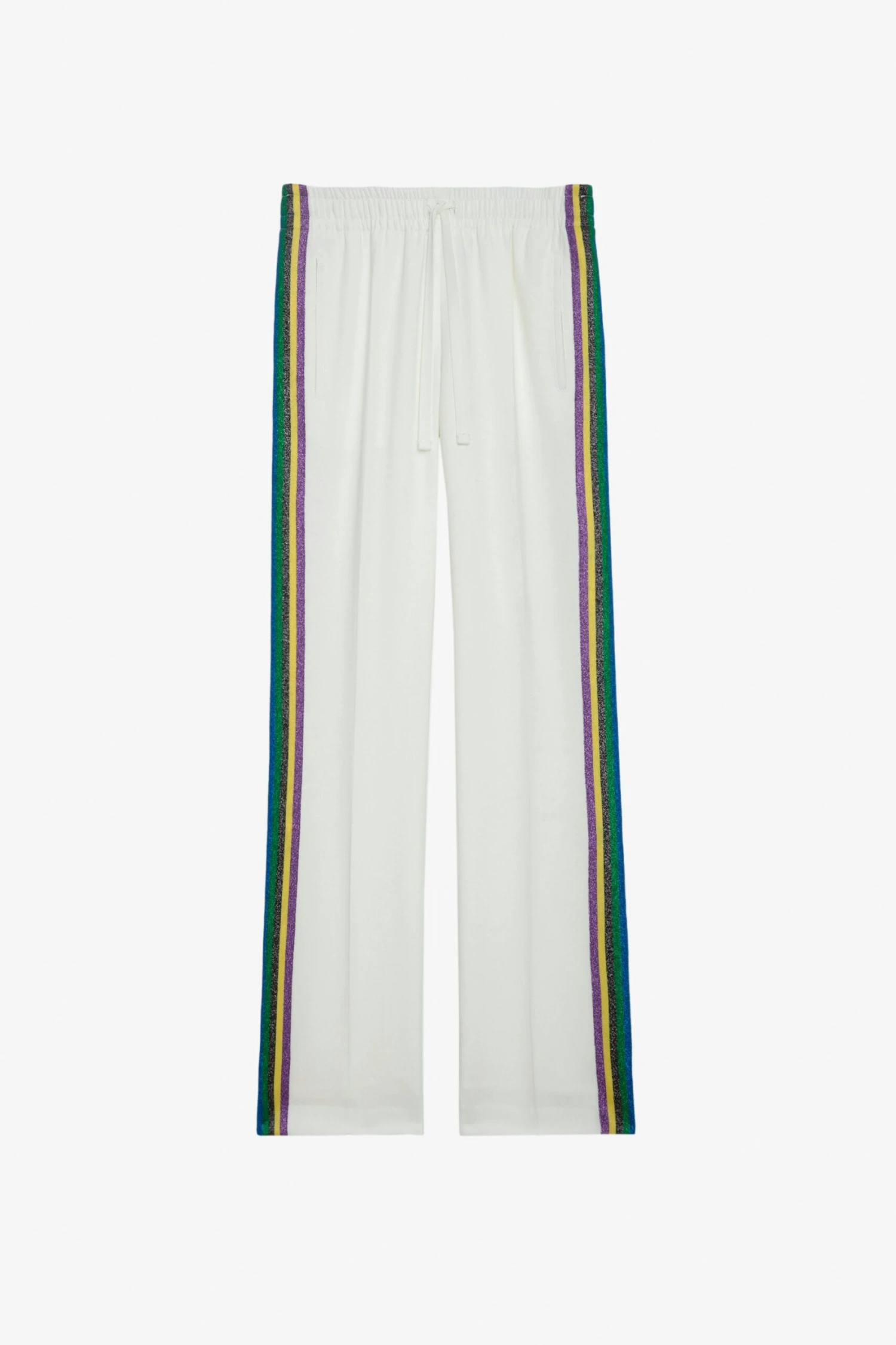 White crêpe pants with glittery side bands and drawstring ties.