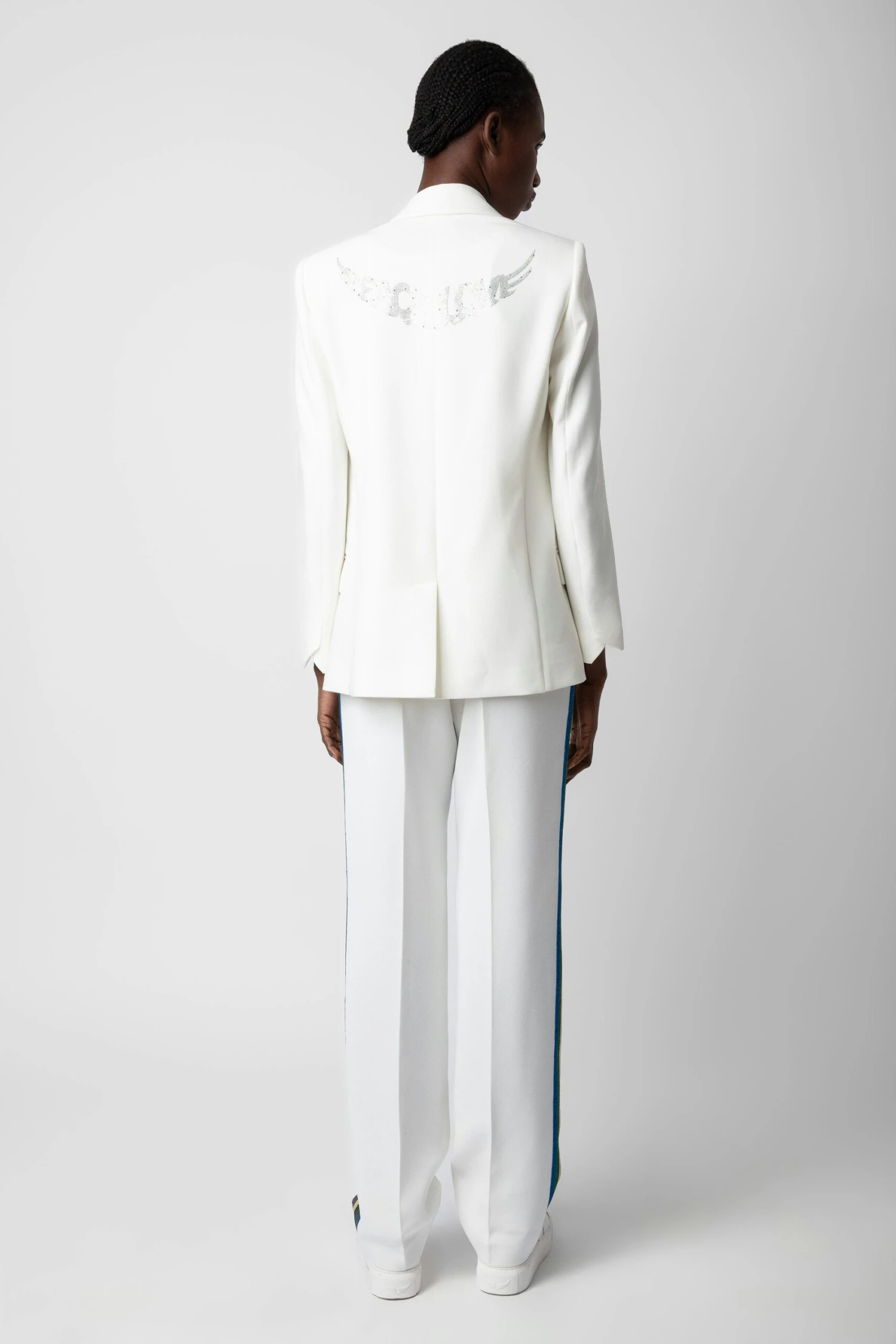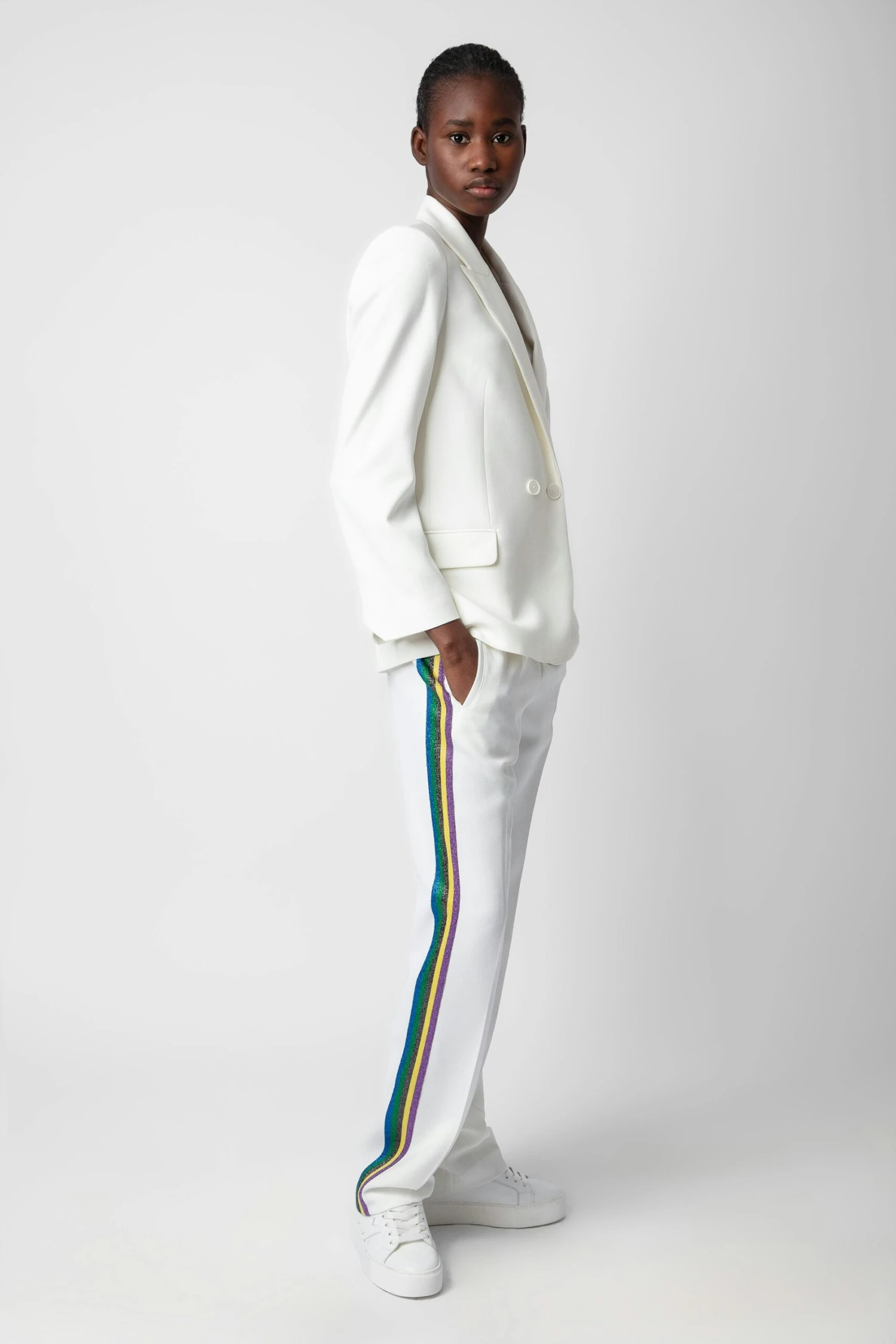 – Women’s Judo white flowing crêpe pants – Multicolored glittery side bands – Drawstring at the waist and 2 side pockets – Made in Portugal Model is 177 cm / 5′ 9″ and is wearing a size S**recycled fibers