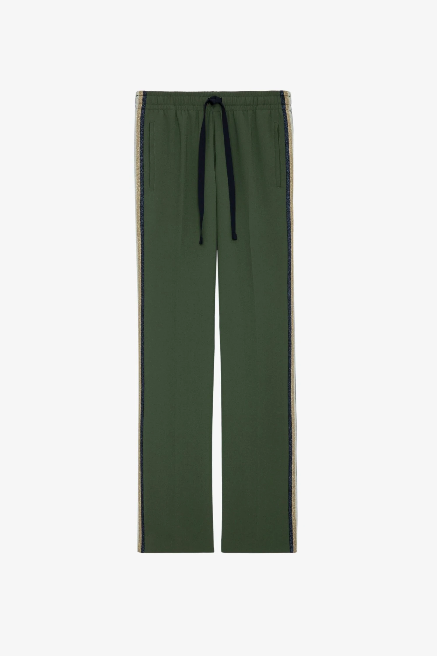 – Women’s khaki unstructured pants – Glittery side bands – Drawstring waist – 2 pocketsModel is 174 cm / 5′ 8″ and is wearing a size 36**recycled fibers