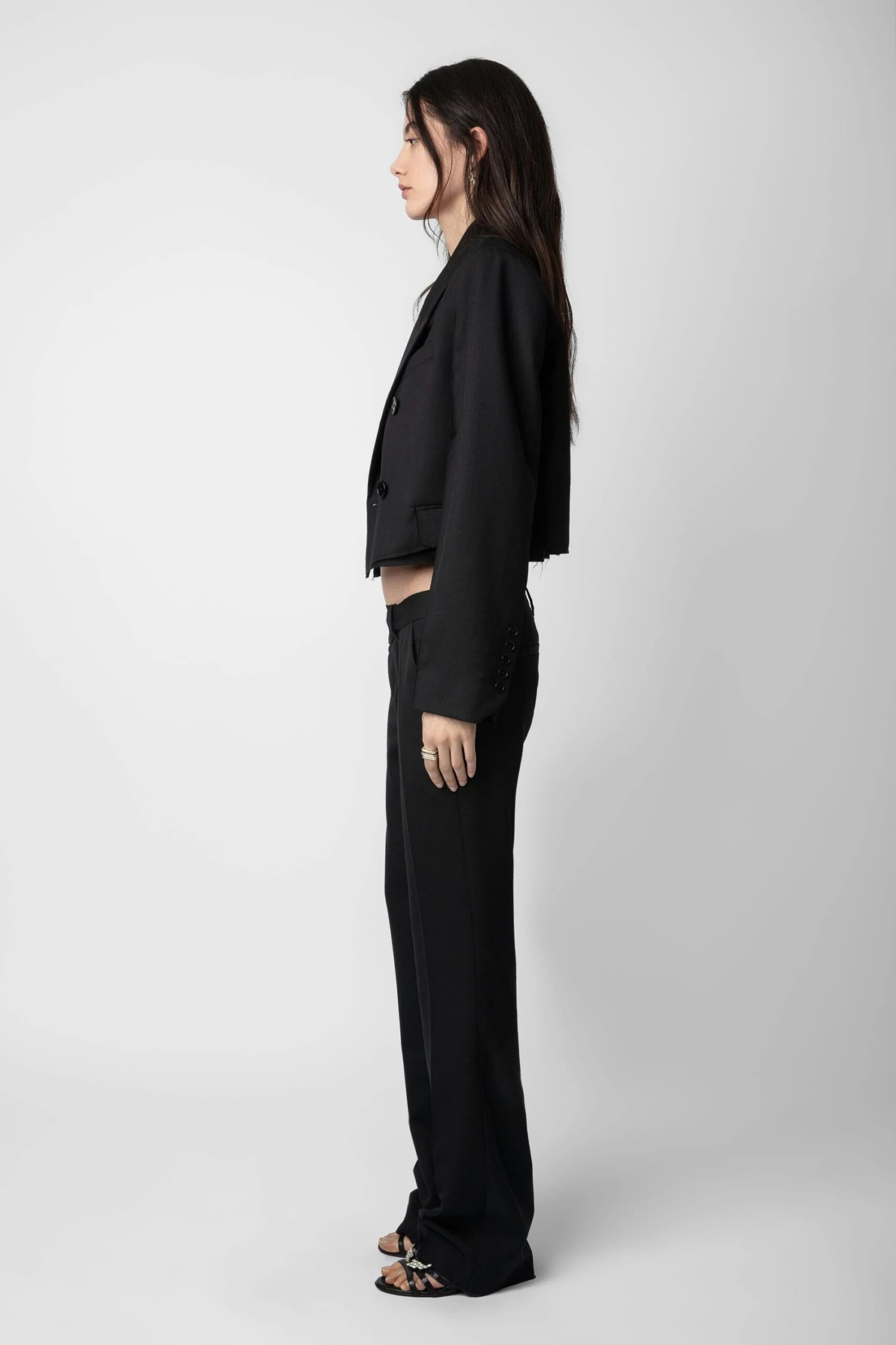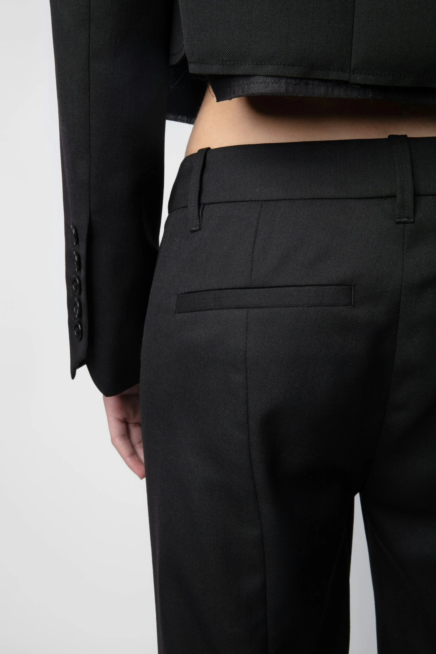 Black cool wool loose-fitting tailored pants with asymmetric fly and raw details.