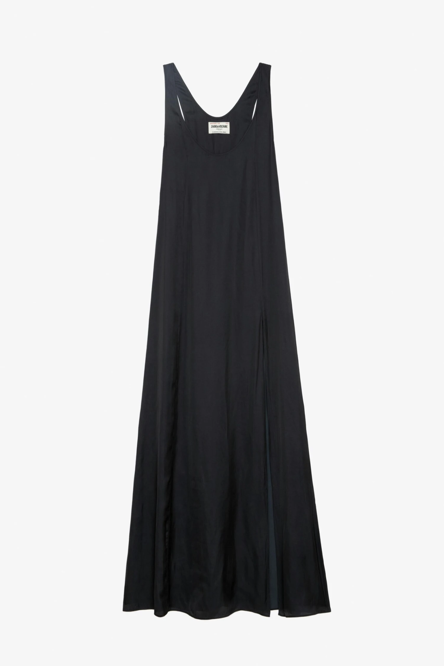 – Women’s long black flowing satin dress – Round neckline and cutaway shoulders – Flared skirt with split **recycled fibers