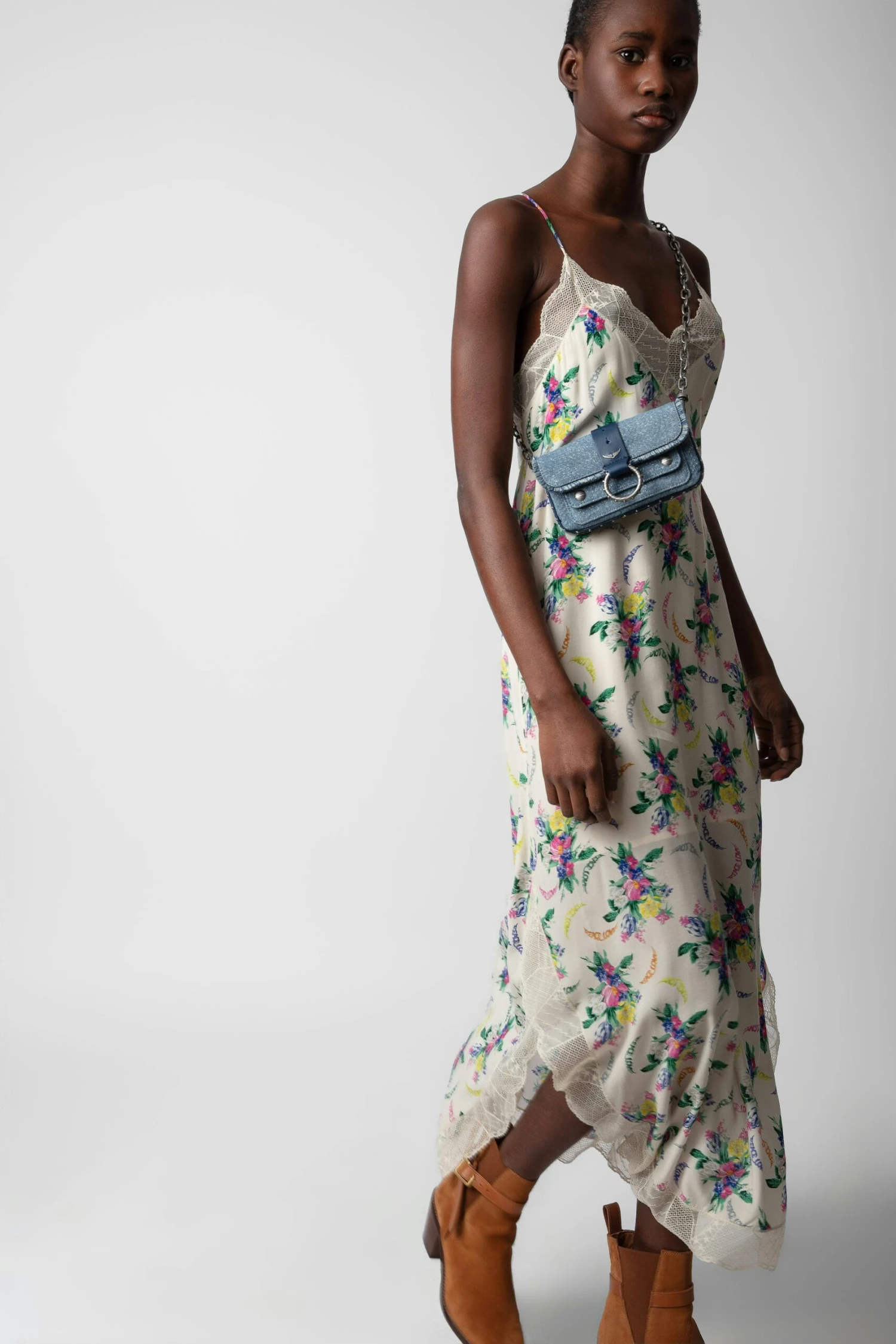 – Women’s Mastic pale pink long flowing lingerie-style dress – Soft Bouquet print – V neckline – Thin non-adjustable straps and splits at the hem – Lace bands