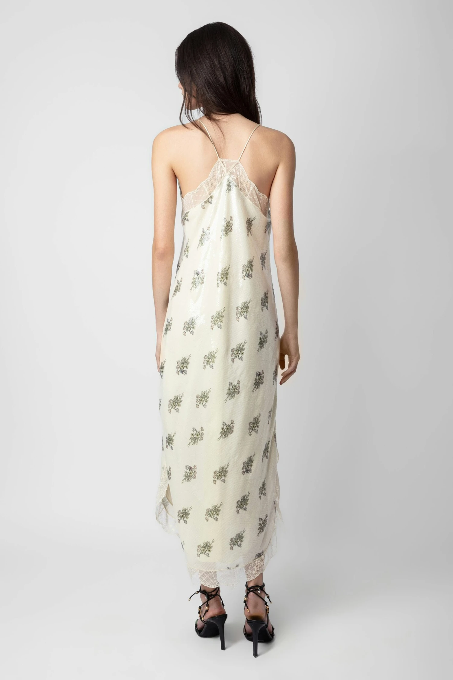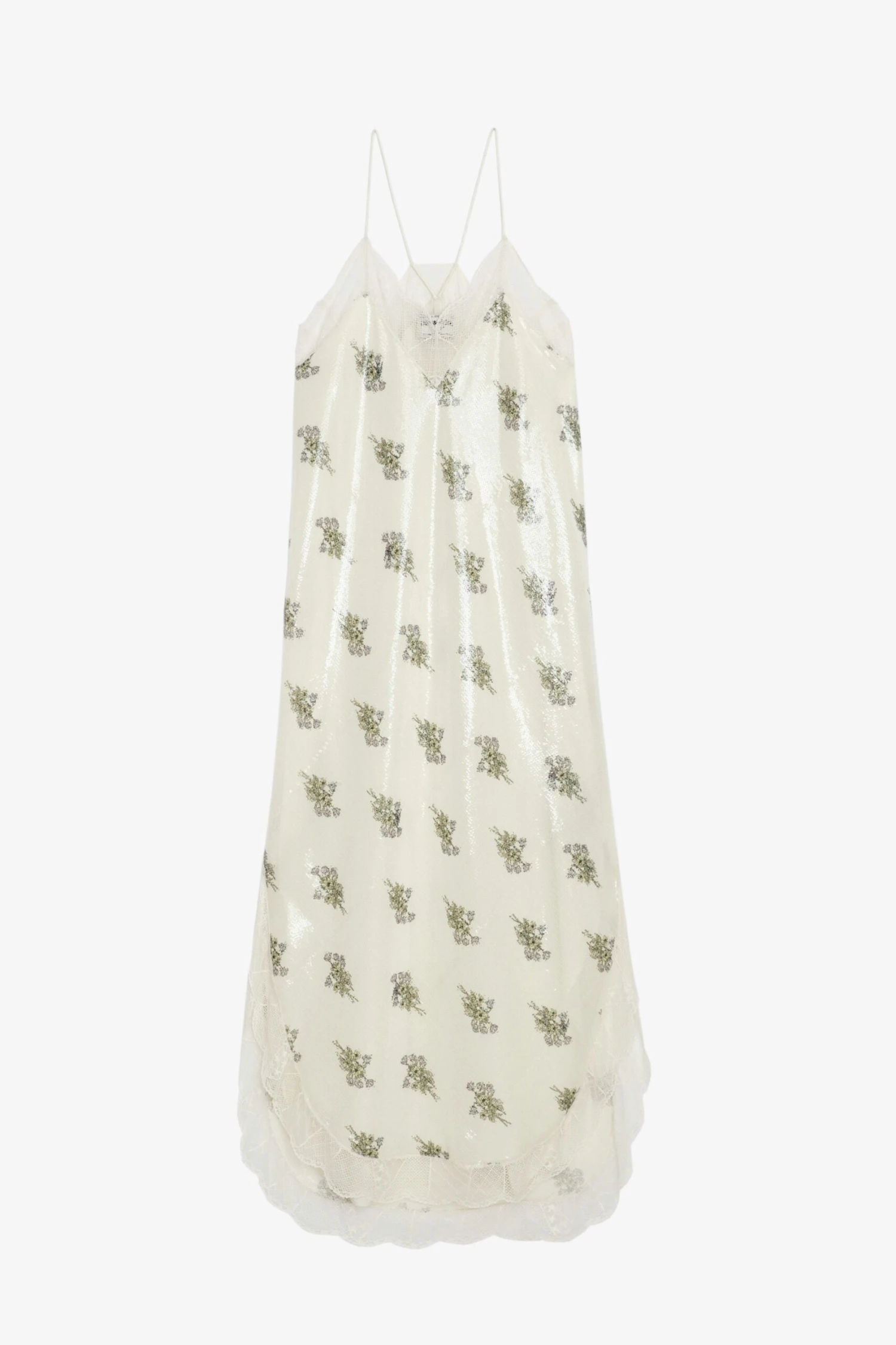 Ecru lingerie-style long dress with floral print, sequins, straps and lace trim.