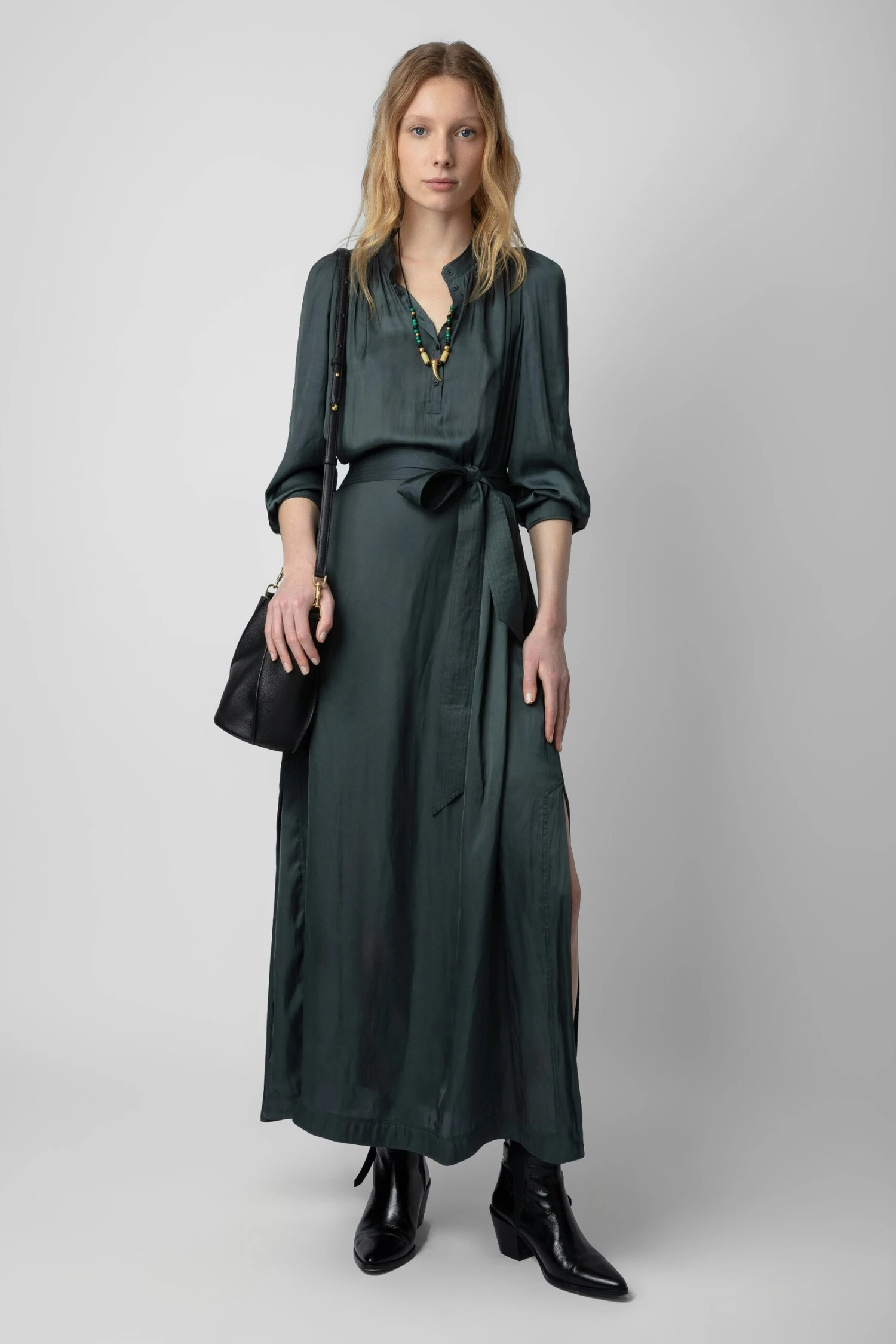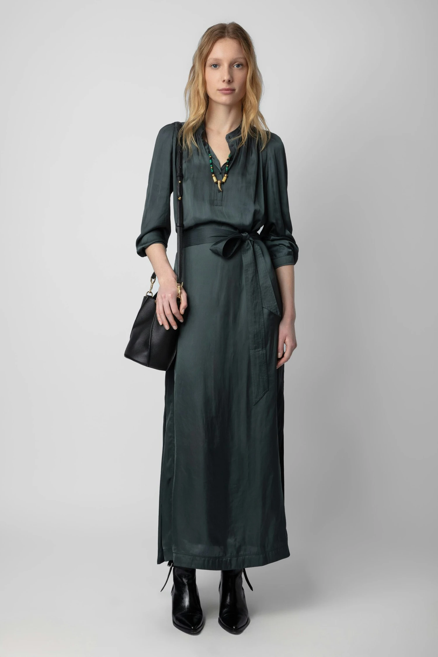 Black satin long dress with 3u002F4-length sleeves and tie at the waist.