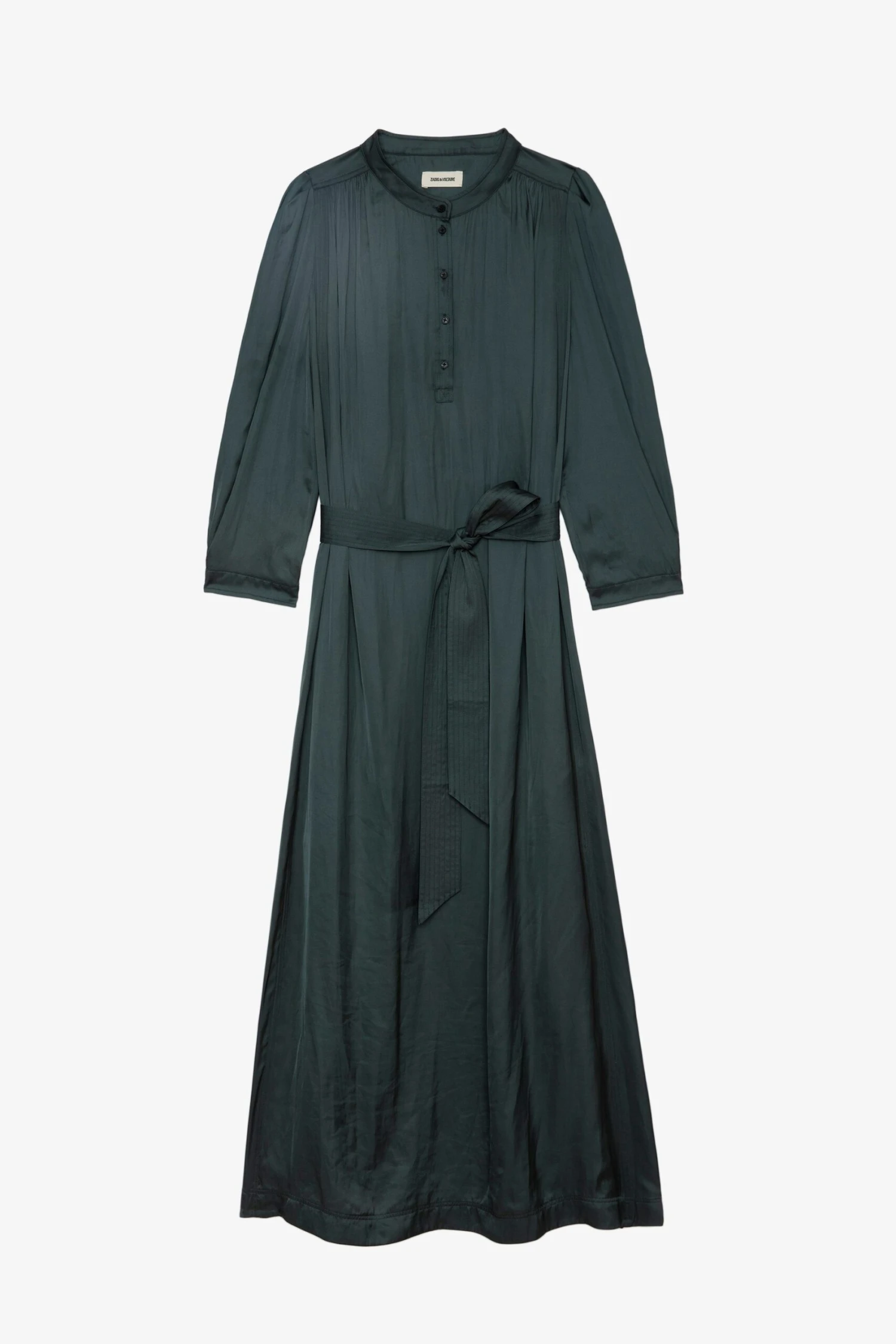 – Women’s long black flowing satin dress – Round, buttoned neckline – Gathered details and pleats at the back – Tie belt and smocked waist at the back – 3u002F4-length sleeves and buttoned cuffs Model is 178 cm / 5′ 10″ and is wearing a size S**recycled fibers