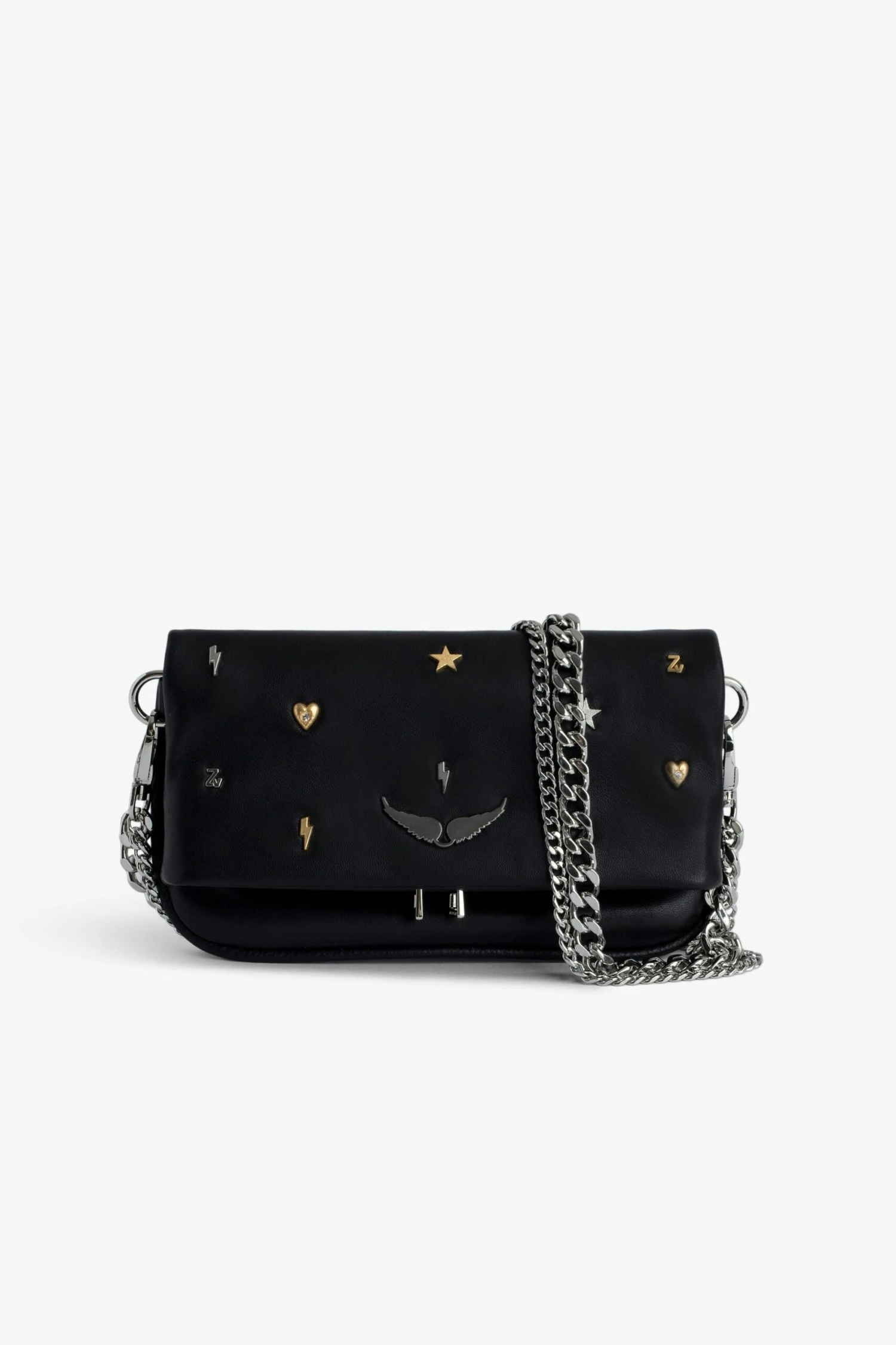 Small black smooth leather clutch with double chain decorated with lucky charms.