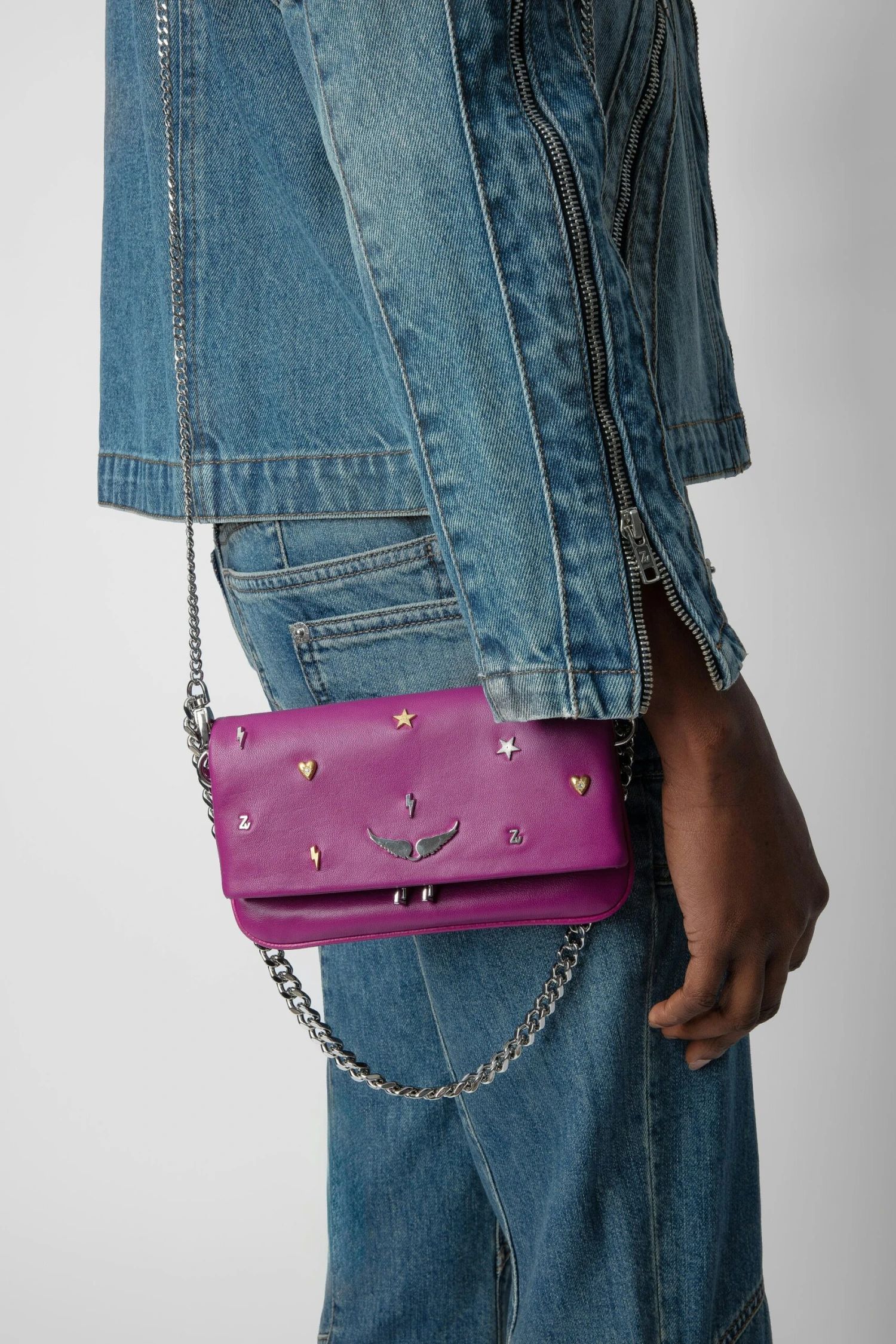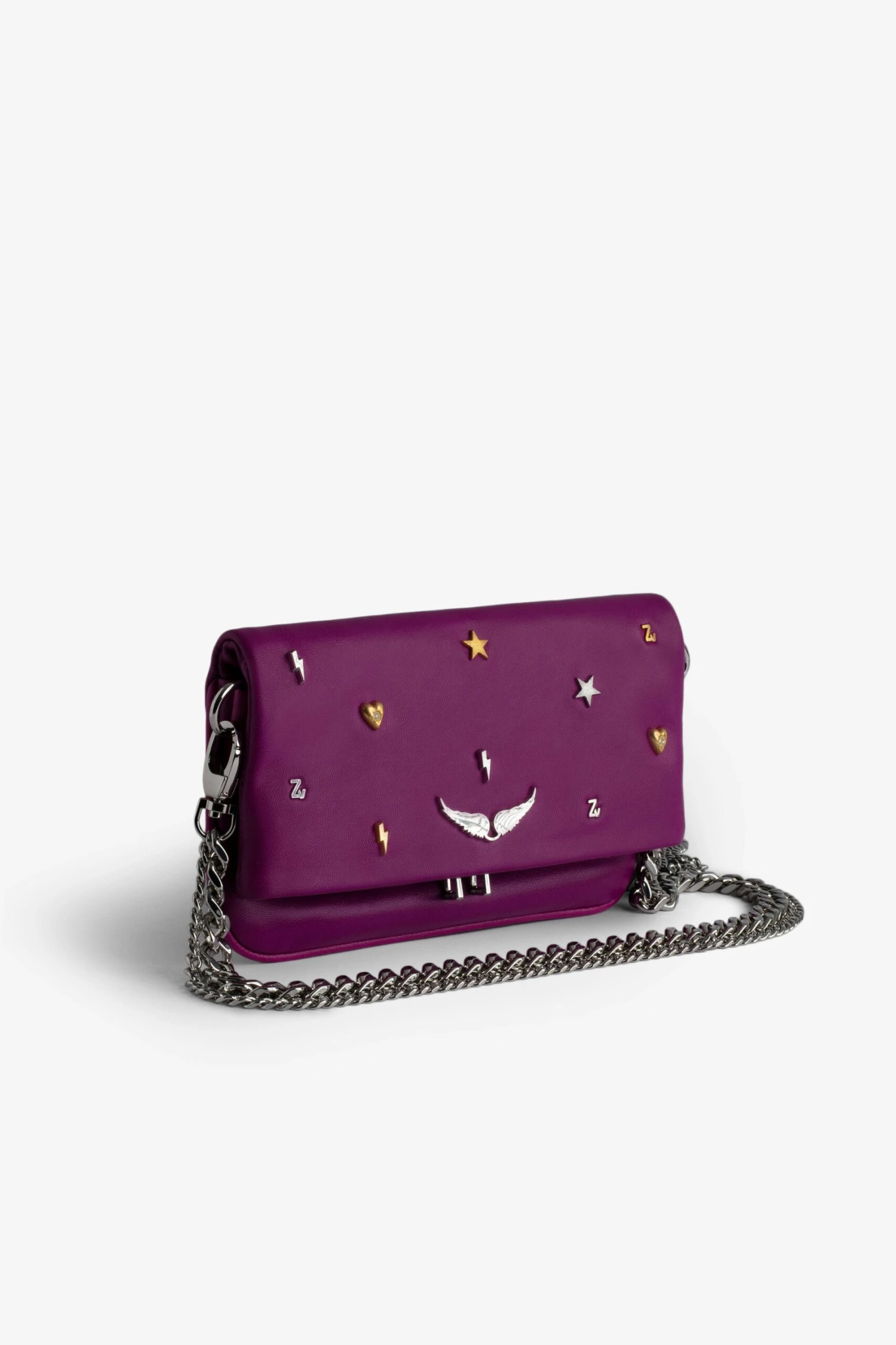Women’s small purple grained leather clutch with chain straps, charms, and wings.