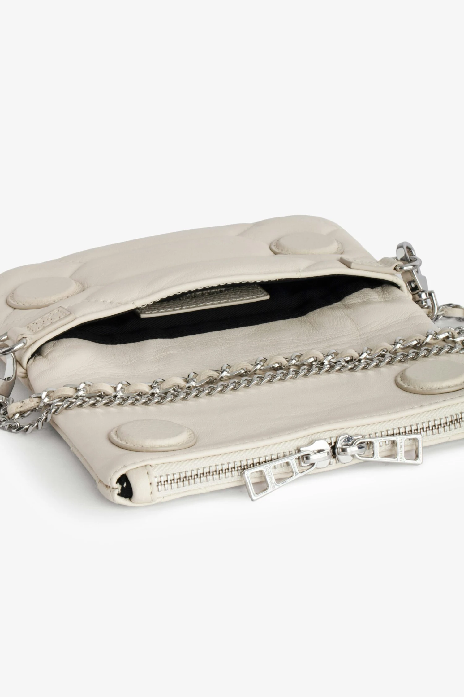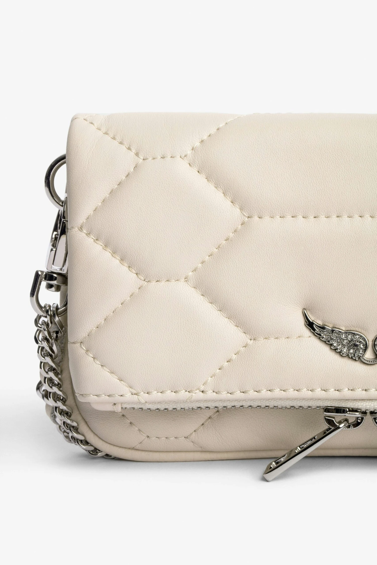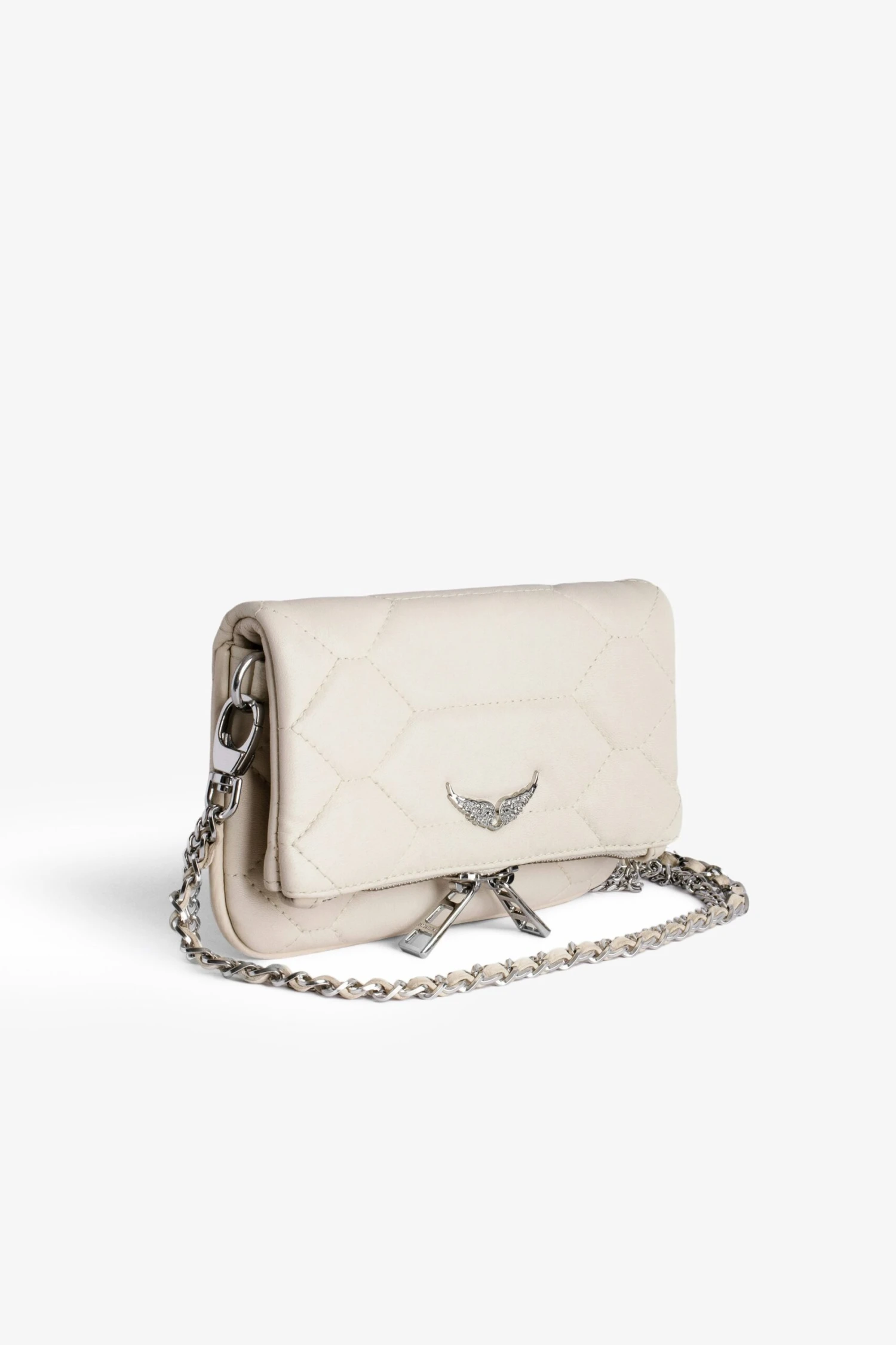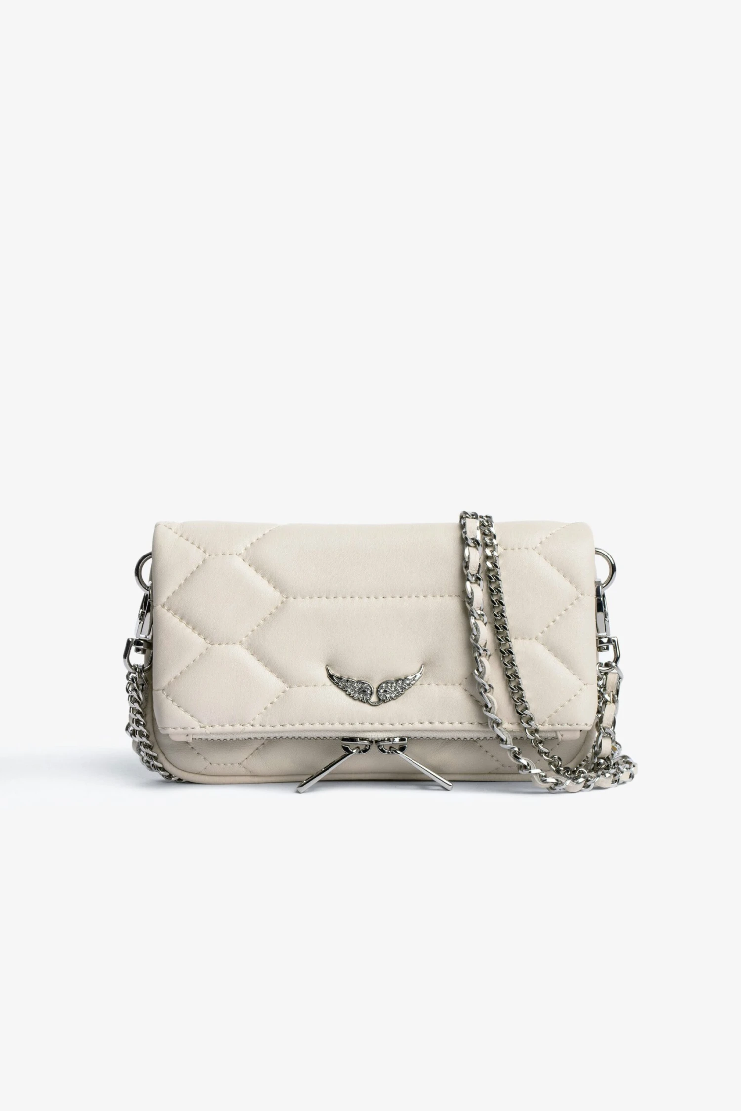 A nano version of the iconic Rock clutch for carrying just the essentials. Carried by hand or worn on the shoulder, it is an essential for day or night. This quilted leather version is embellished with crystal-set wings and a double chain to wear it across the body or on the shoulder. – Zadig&Voltaire Women’s Rock Nano clutch in ecru quilted leather – Wear on the shoulder or across the body – 3 compartments, two of which are zipped – Flap with magnetic closure – Removable double leather and metal chain – Holds a mobile phone up to 158 x 77.8 x 8.1 mm (type IPhone Pro Max)The Leather Working Group/LWG is a membership organization comprised of brands, suppliers, leather manufacturers and other stakeholders within the leather manufacturing industry. The group has developed an auditing program which certifies leather manufacturing facilities based on their environmental compliance and performance capabilities