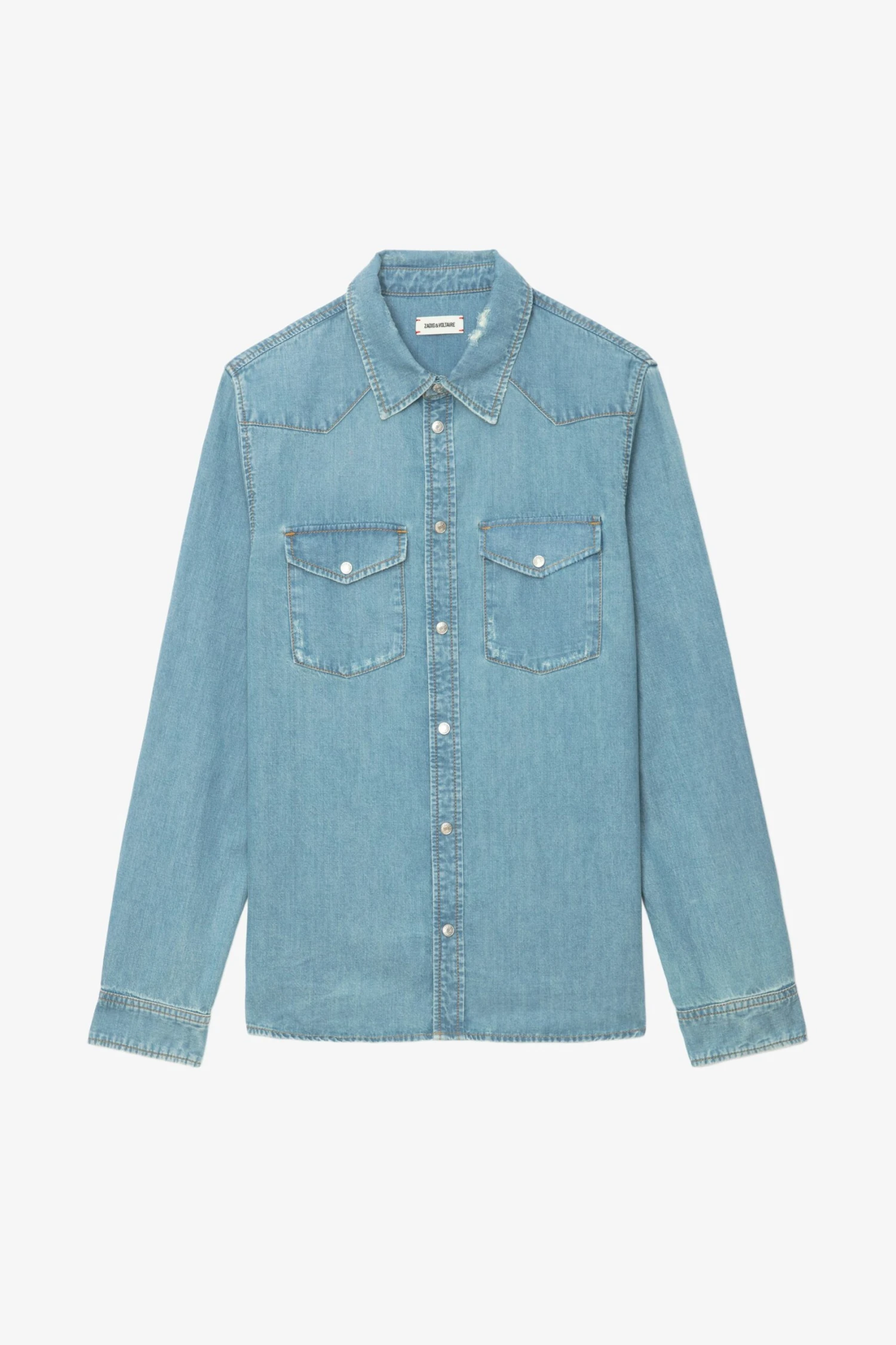 Distressed-effect blue denim shirt with long sleeves.