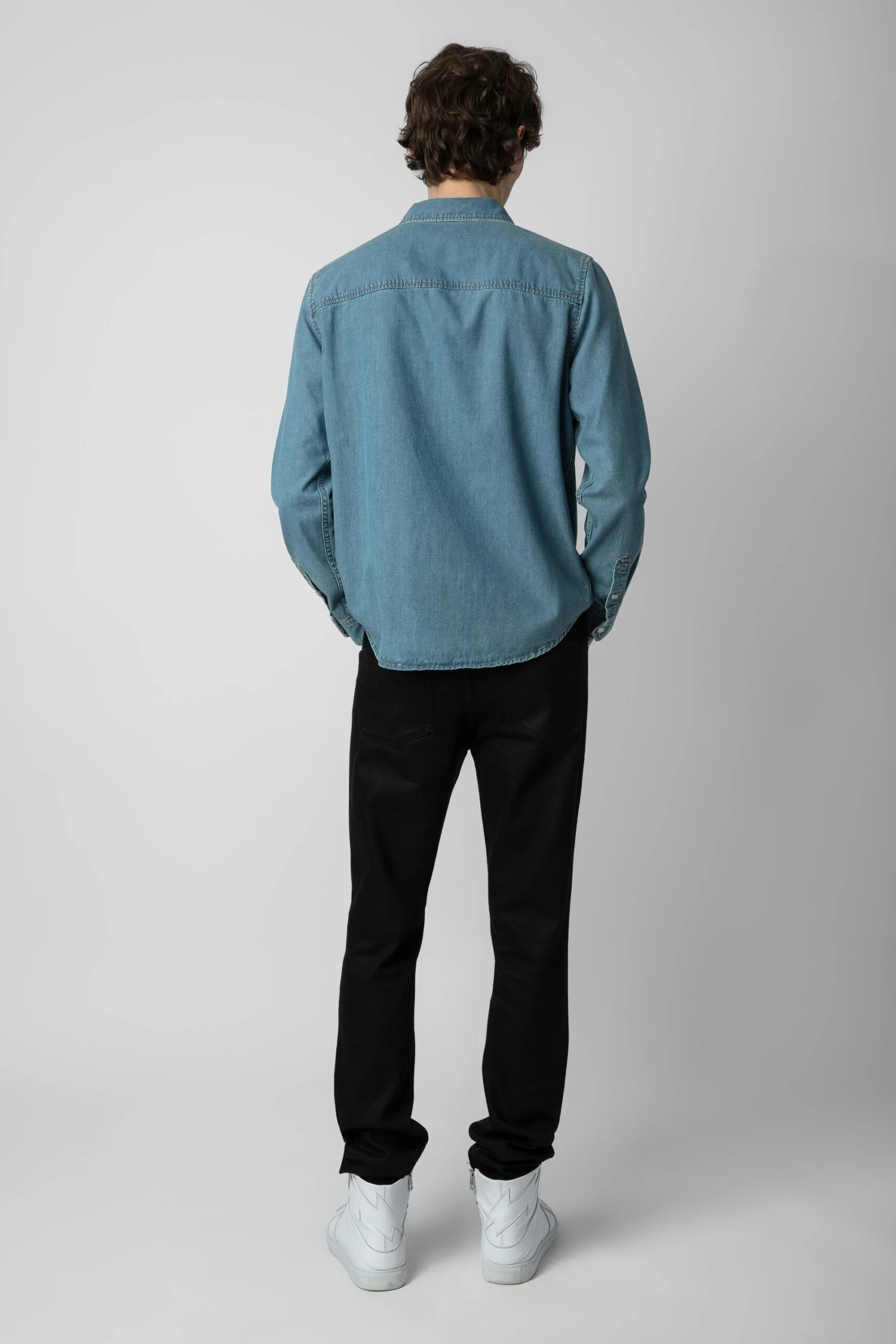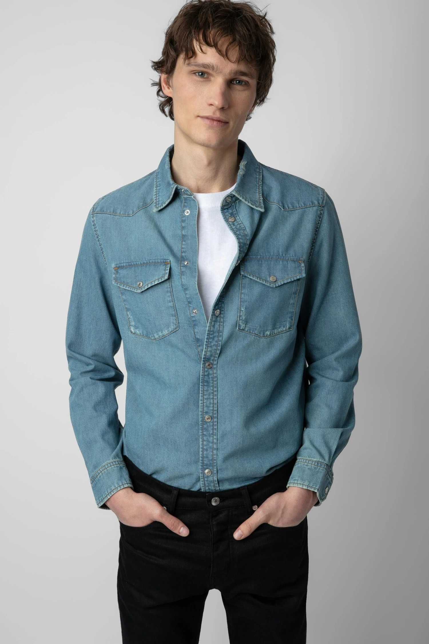 – Men’s distressed-effect Ciel Stone blue denim shirt – Shirt collar and long sleeves – Closure, 2 flap pockets and press stud cuffs Model is 187 cm / 6′ 1″ and is wearing a size M*100% of fibers comes from organic agricultureThe GOTS certification guarantees that this product does not contain GMOs. It also ensures the absence of harmful substances in the product, a social and environmental responsible management and the end-to-end traceability of the supply chain. The dyes are made with GOTS approved inks and colorants, which do not contain toxic heavy metals and do not require aromatic solvents nor harmful substances.