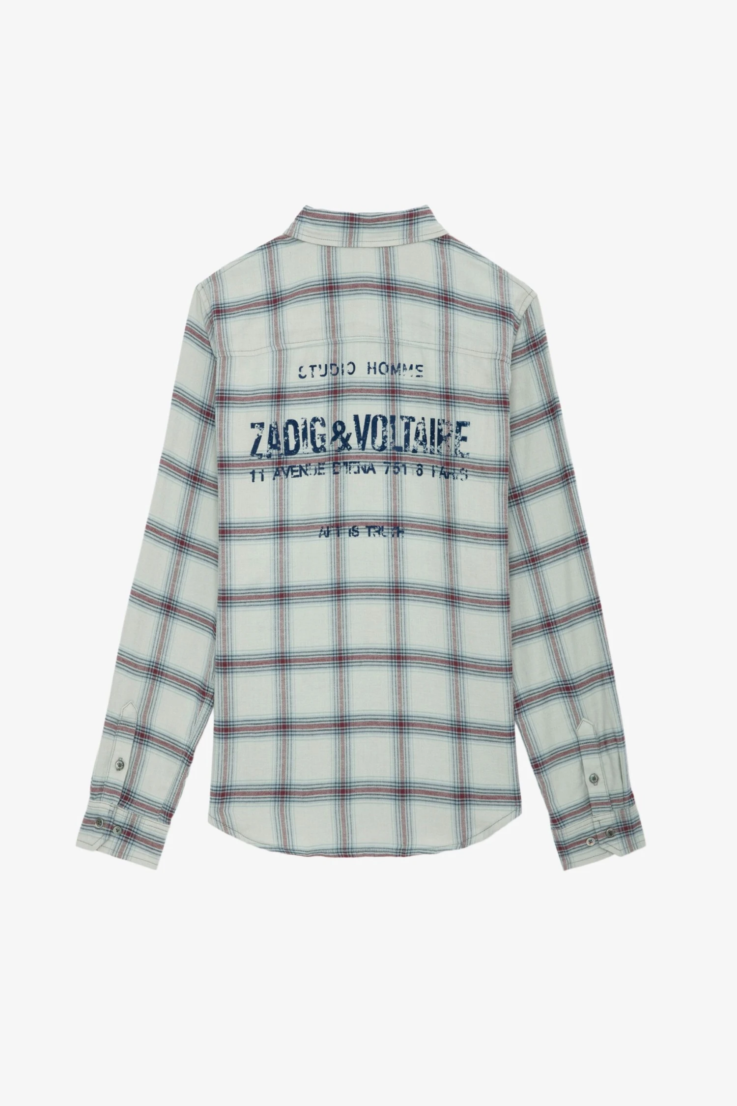 Checked grey cotton flannel buttoned shirt with distressed-effect Studio Homme flocking on the back.