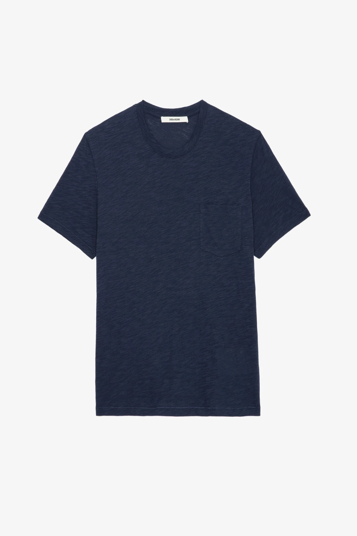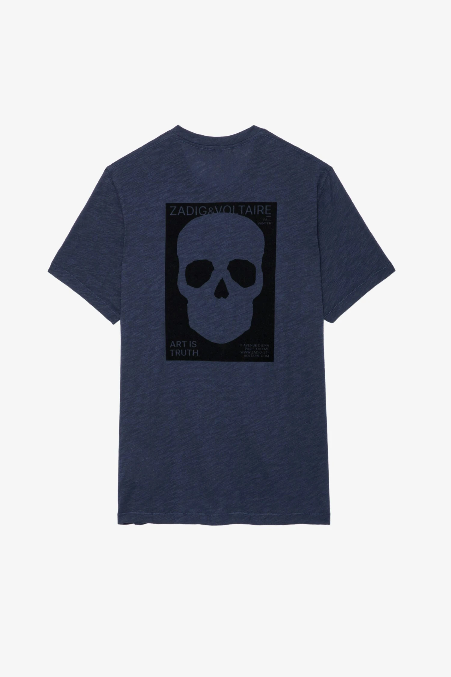 Navy blue slub cotton short-sleeved T-shirt with pocket and Skull Block motif on the back.