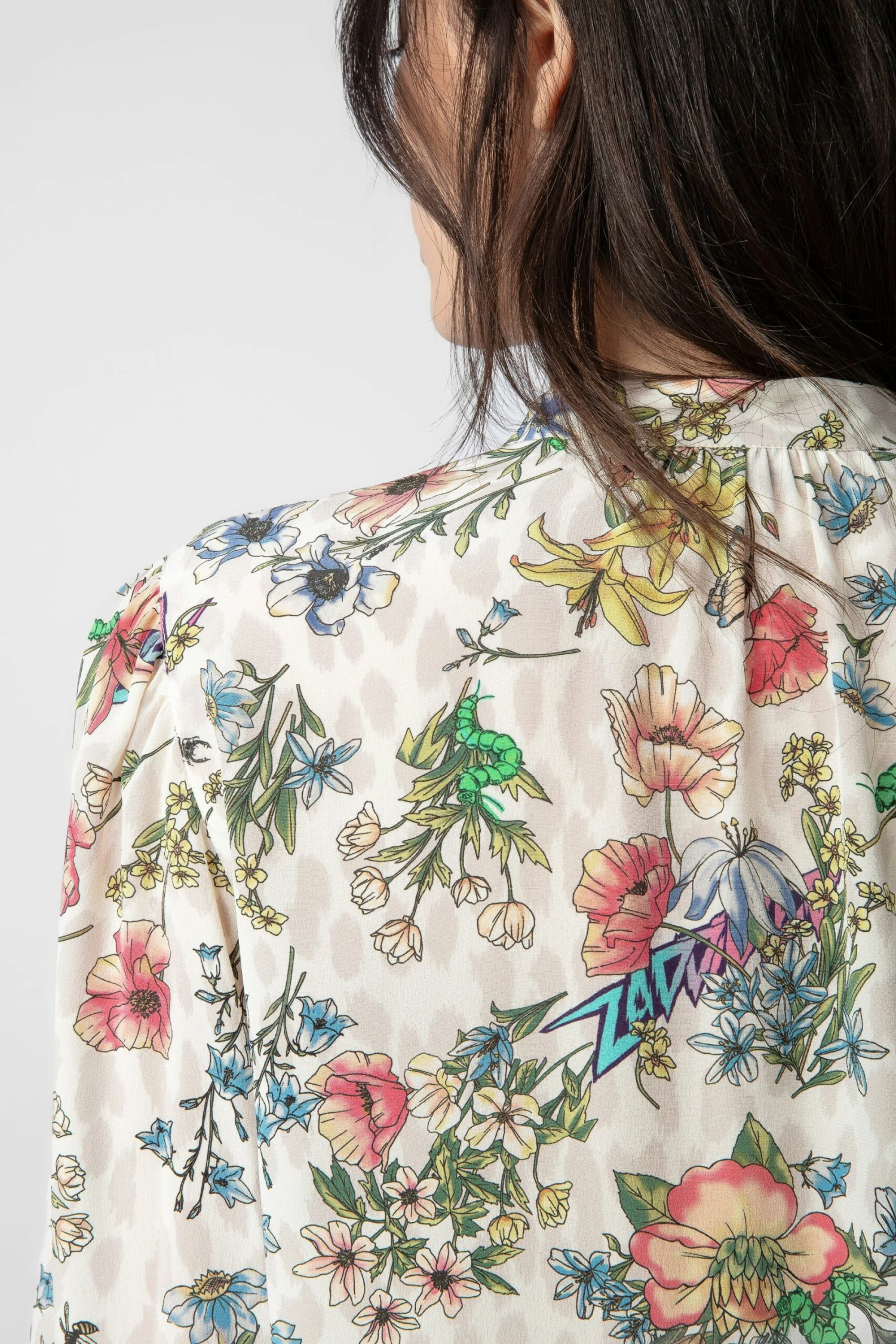 Ecru silk blouse with Twisted Garden print, 3u002F4-length sleeves and diamanté-embellished cuffs.