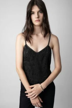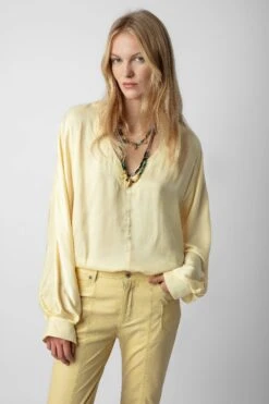 – Women’s black Japanese satin blouse – Buttoned V neckline and gathered shoulders – Long sleeves with fitted cuffs Model is 174 cm / 5′ 8″ and is wearing a size S**recycled fibers