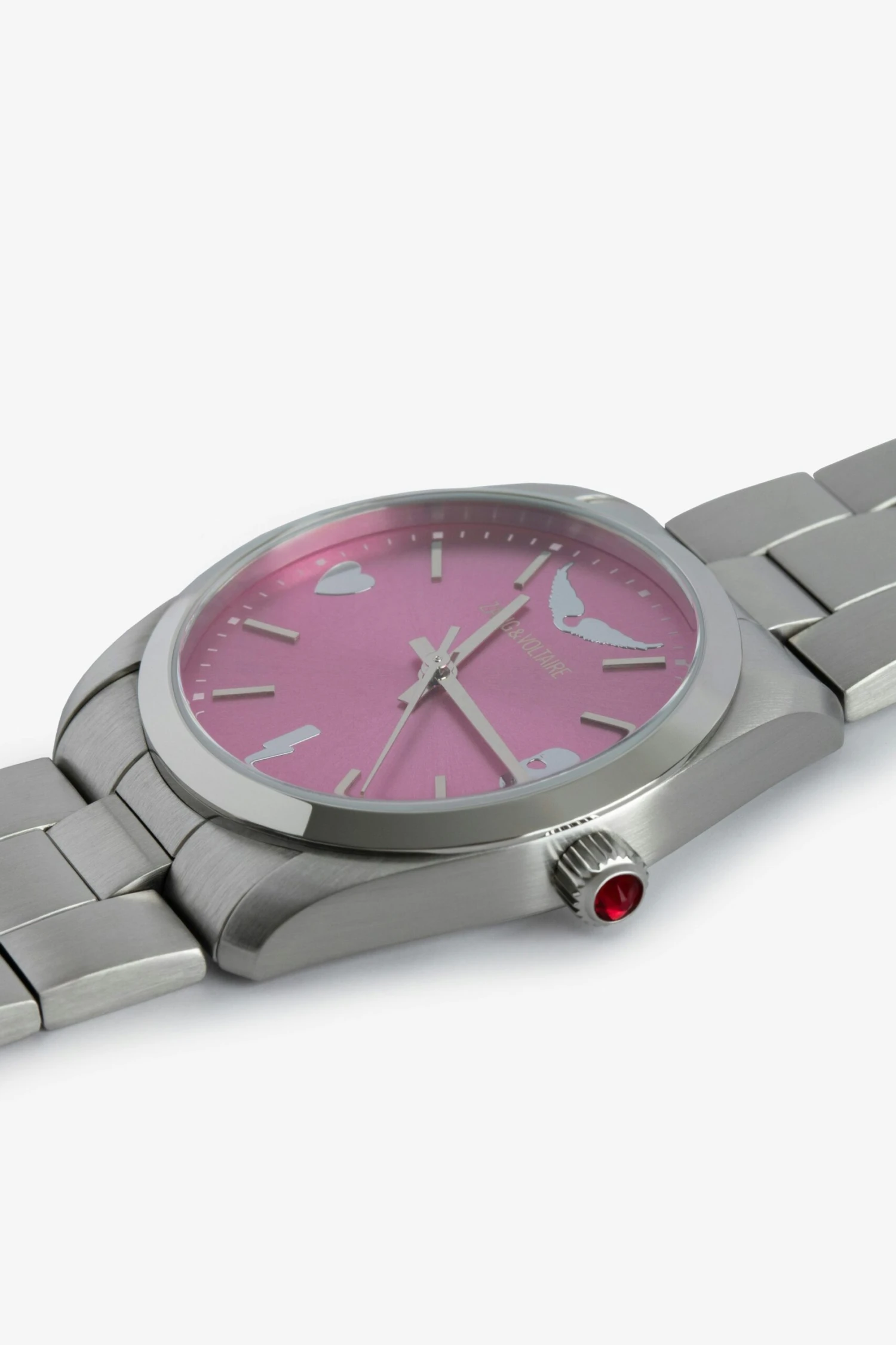 Switch to Zadig&Voltaire time with this stainless steel watch set with a rhinestone, with a pink face in the signature style of the brand. – Zadig&Voltaire women’s stainless steel watch – Pink Date face with signature patterns – Diameter 36 mm – Contrasting rhinestone – Quartz movement – Houru002Fminuteu002Fsecond functions – Steel watchband