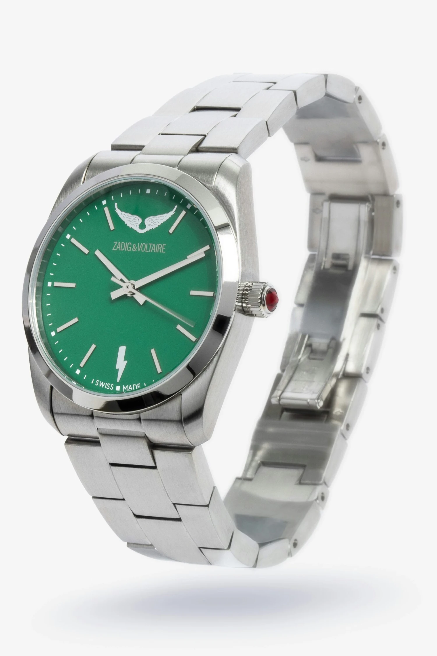 Switch to Zadig&Voltaire time with this stainless steel watch set with a rhinestone, with a matte green face in the signature style of the brand. – Zadig&Voltaire women’s stainless steel watch – Matte green Legend face with signature patterns – Diameter 36 mm – Contrasting rhinestone – Quartz movement – Houru002Fminuteu002Fsecond functions – Steel watchband