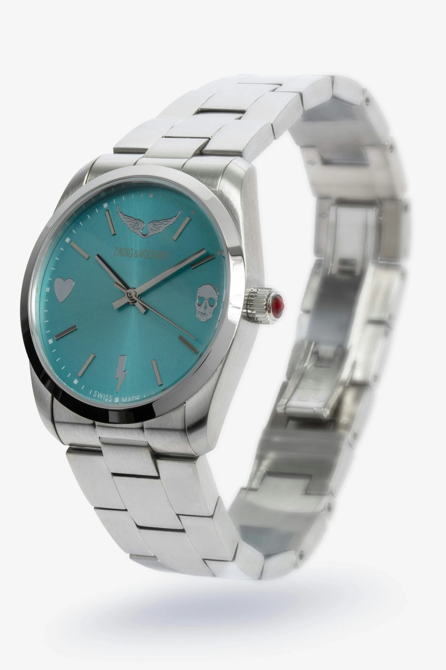 Switch to Zadig&Voltaire time with this stainless steel watch set with a rhinestone, with a blue face in the signature style of the brand. – Zadig&Voltaire women’s stainless steel watch – Blue Reflect face with signature patterns – Diameter 36 mm – Contrasting rhinestone – Quartz movement – Houru002Fminuteu002Fsecond functions – Steel watchband