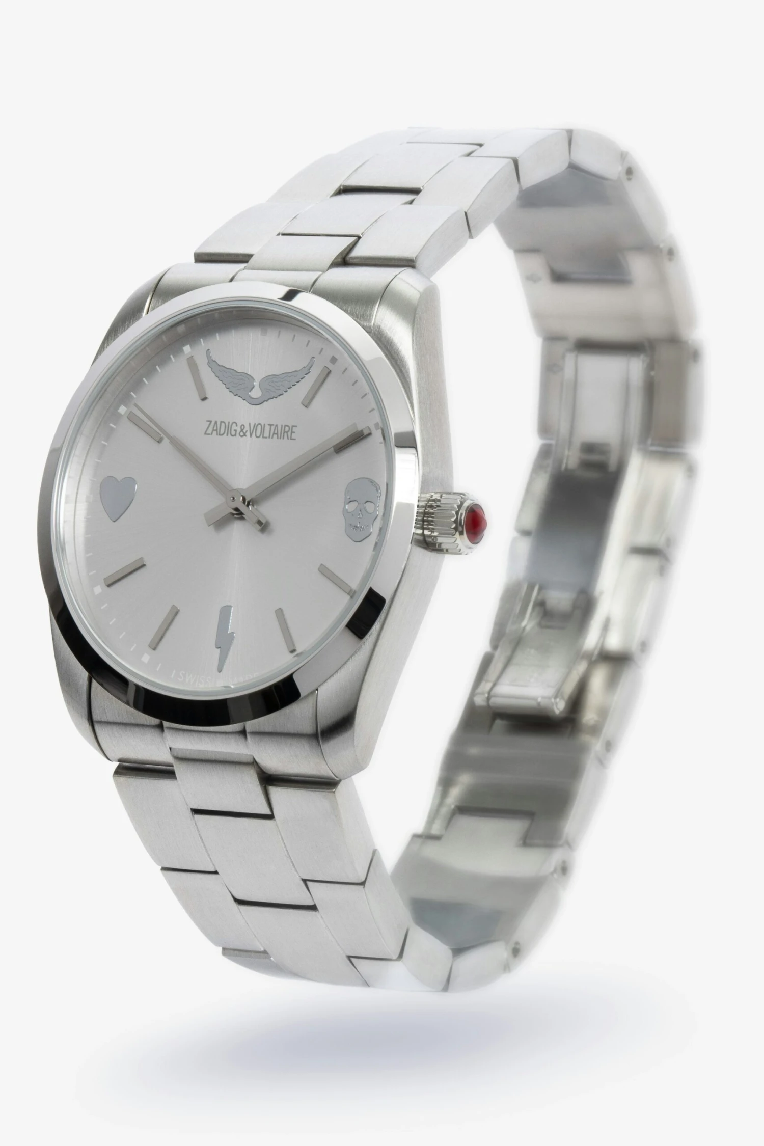 Switch to Zadig&Voltaire time with this stainless steel watch set with a rhinestone, with a silver face in the signature style of the brand. – Zadig&Voltaire women’s stainless steel watch – Silver grey face with signature patterns – Diameter 36 mm – Contrasting rhinestone – Quartz movement – Houru002Fminuteu002Fsecond functions – Steel watchband