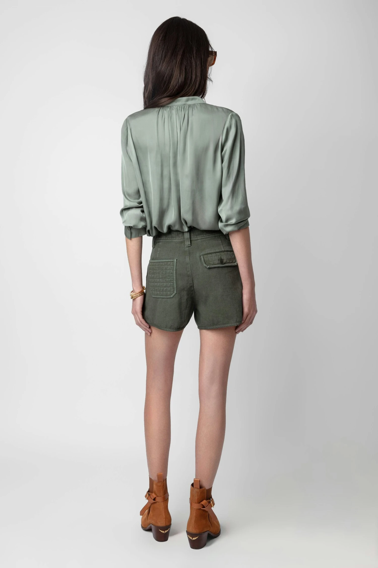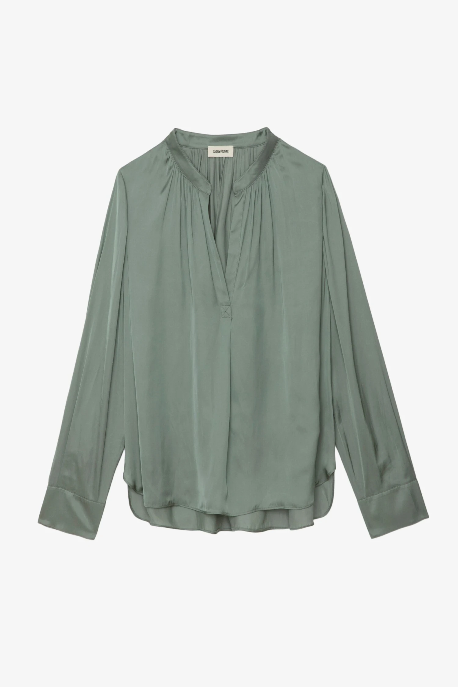 – Women’s Treillis grey flowing satin blouse – Gathered details and pleats on the back – Open collar – Long sleeves and buttoned cuffs **recycled fibers