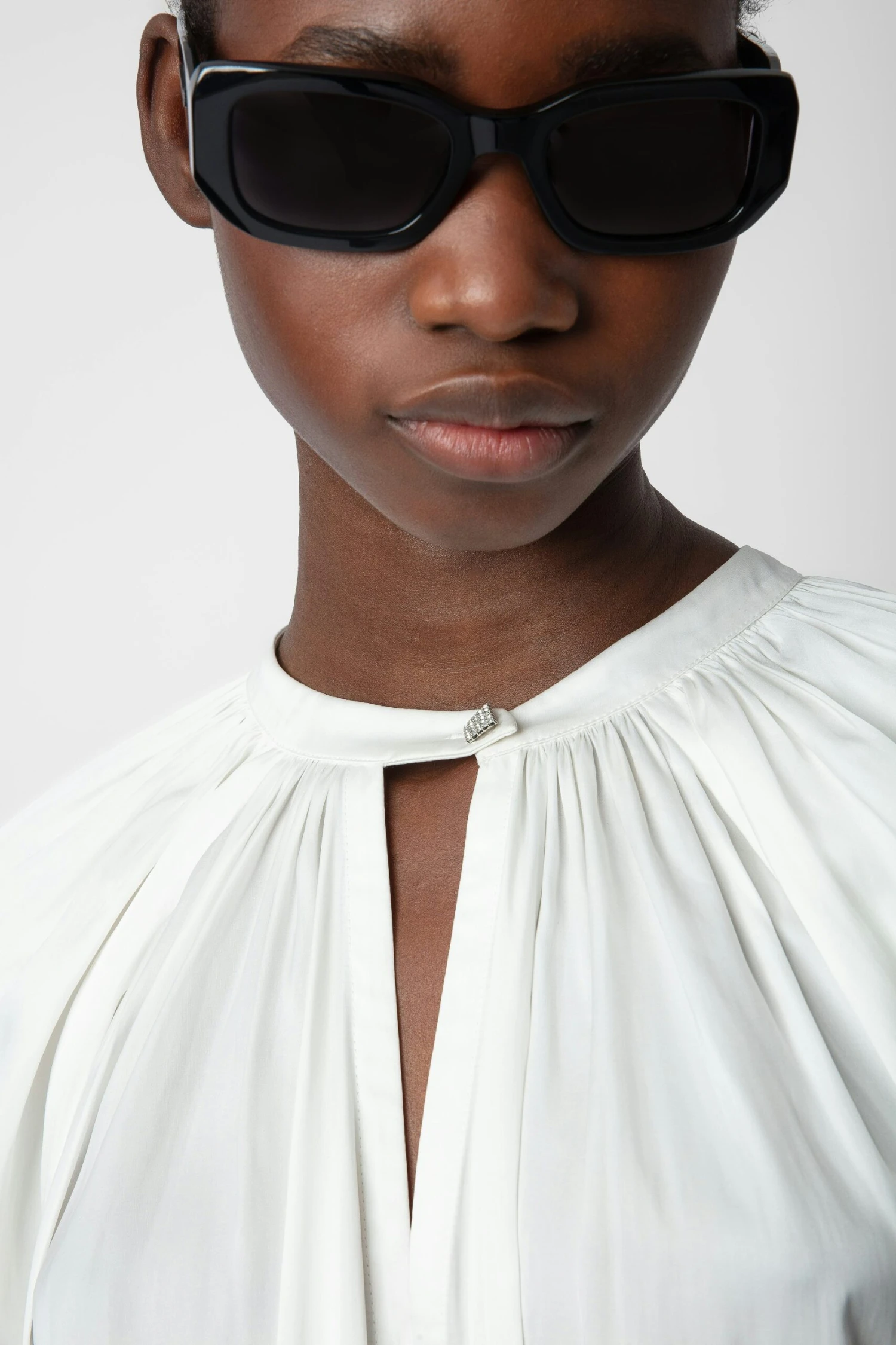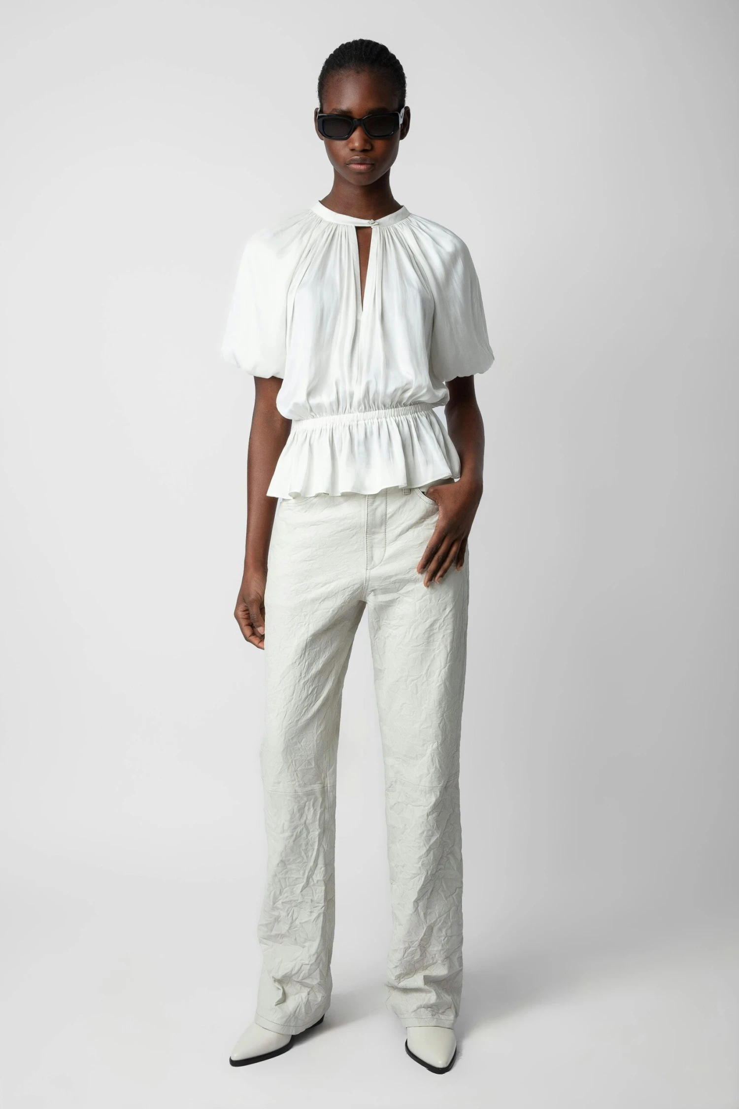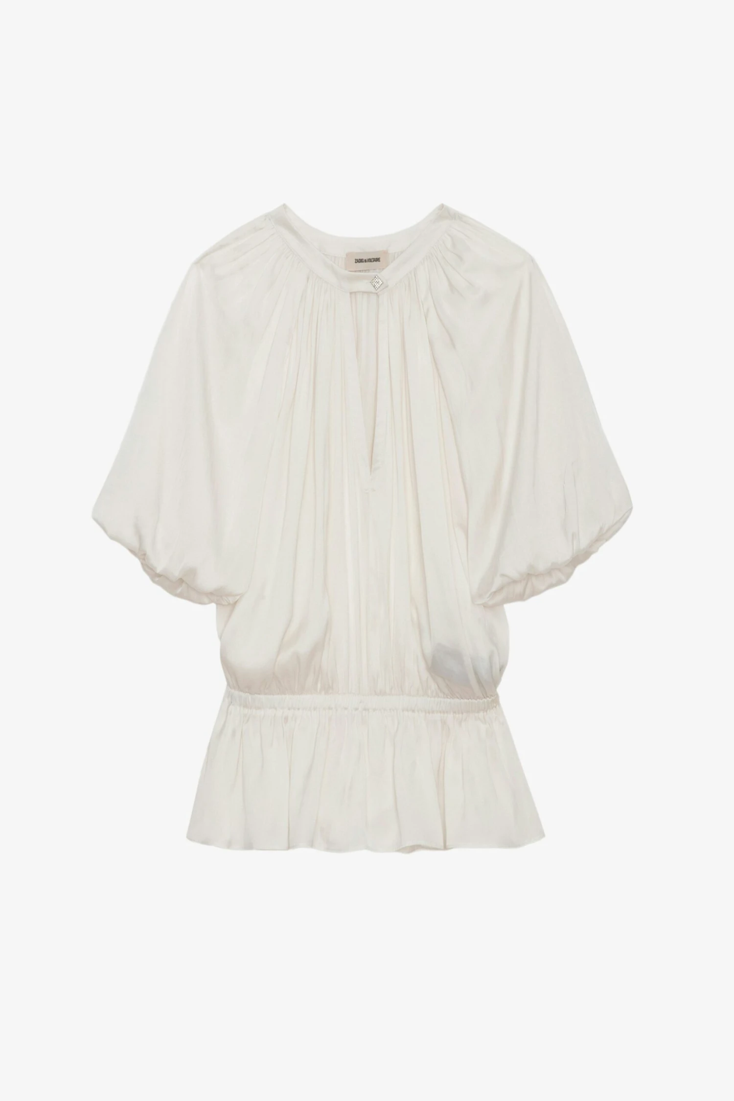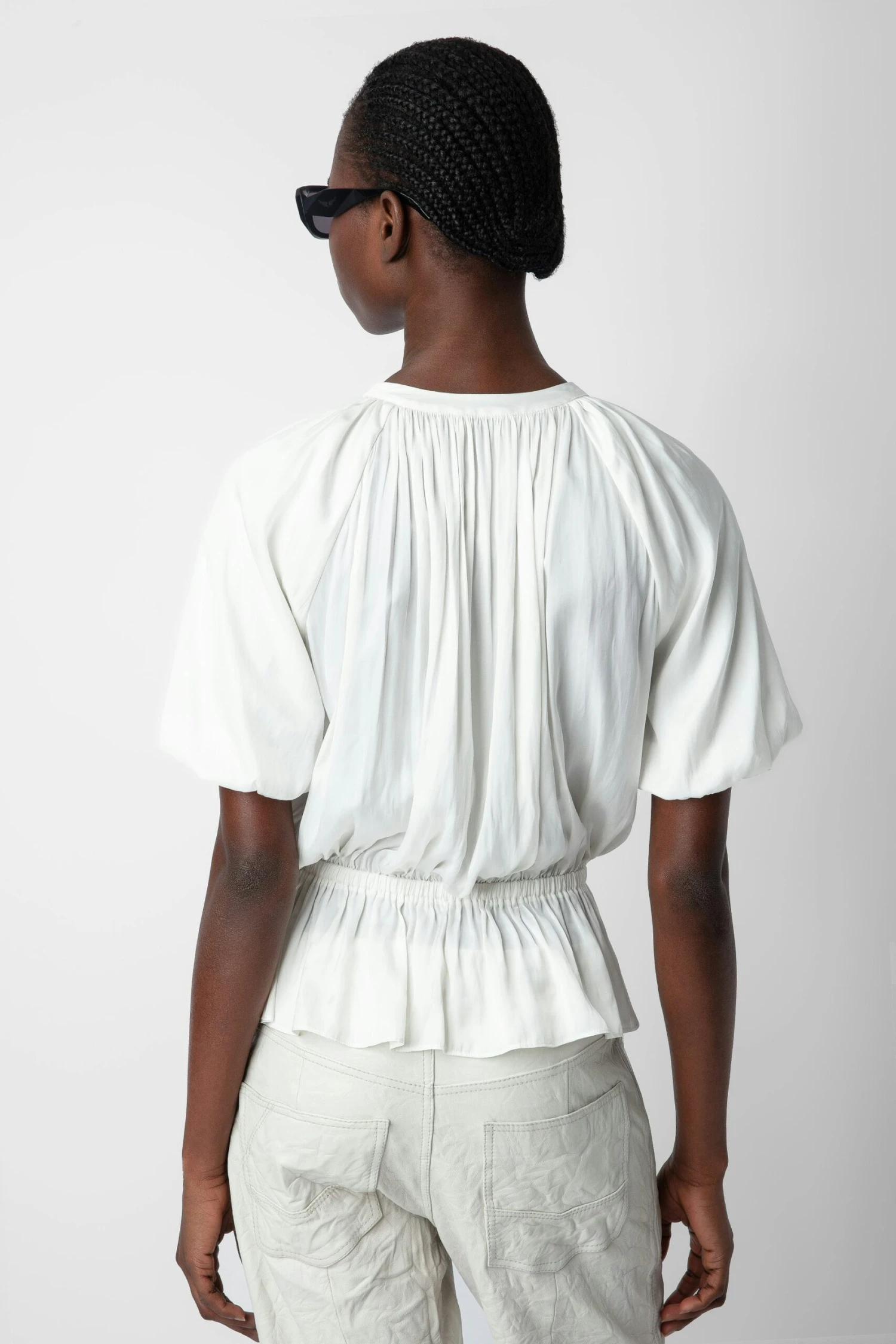 – Women’s white satin blouse – Short puff sleeves with elasticized cuffs – Elasticized peplum style waist – Button closure at collar – V necklineModel is 174 cm / 5′ 8″ and is wearing a size S**recycled fibers