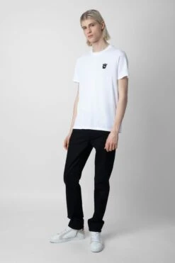 Men’s white cotton T-shirt featuring a Skull XO patch on the chest.