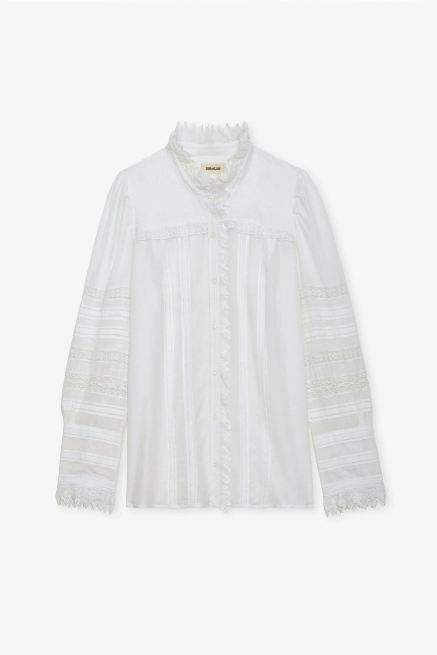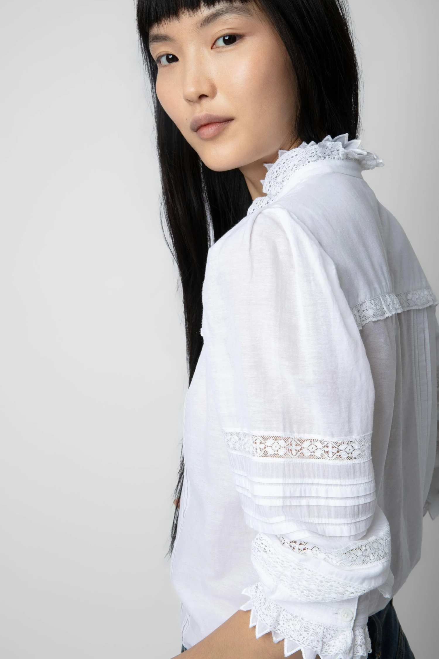 White cotton blouse with long puff sleeves, lace bands and gathers.