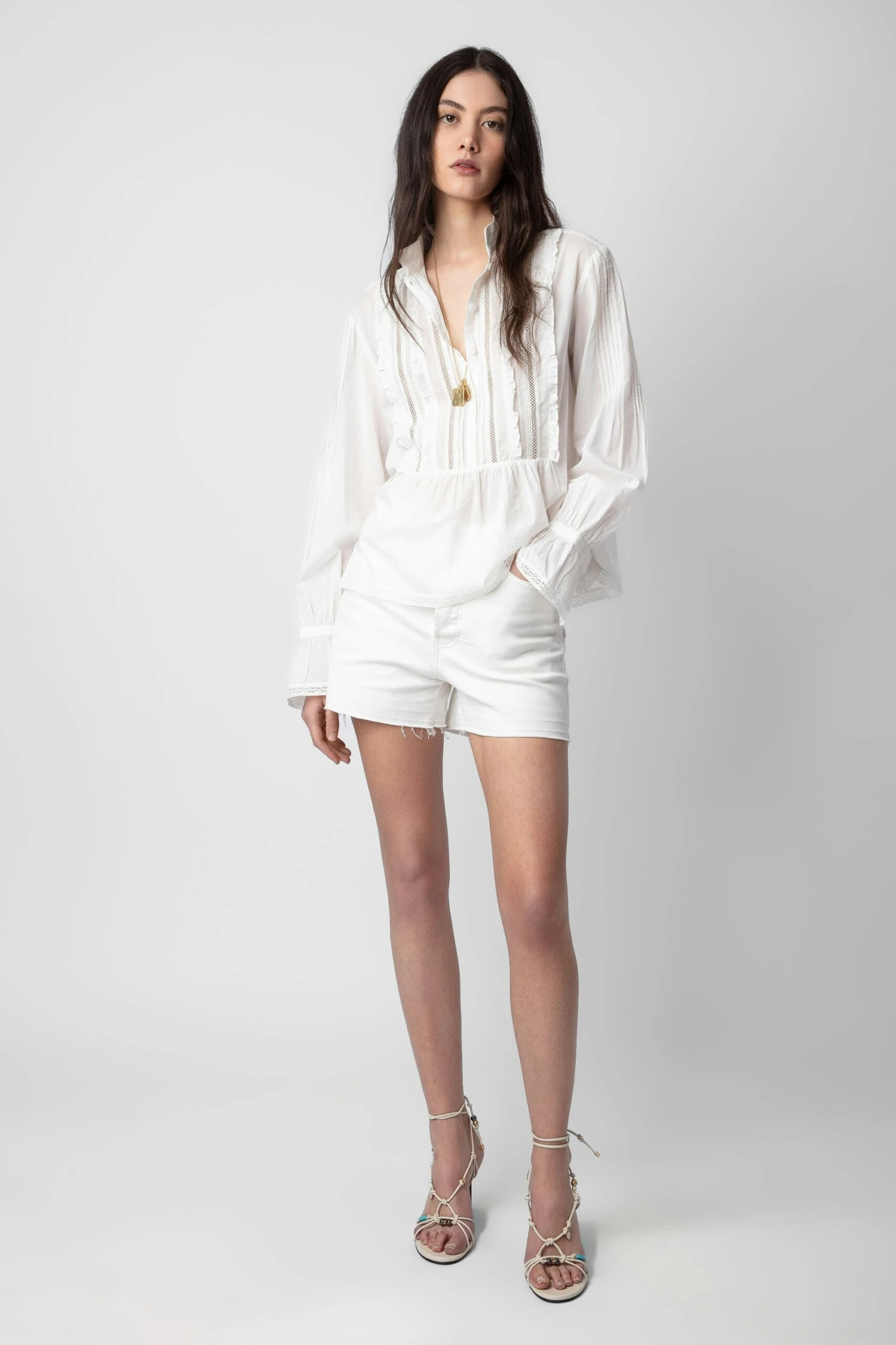 – Women’s white ruffled blouse – Half button closure down front – Long sleeves with flared cuffs – Ruffles on frontModel is 174 cm / 5′ 8″ and is wearing a size S**Fibers from organic farming