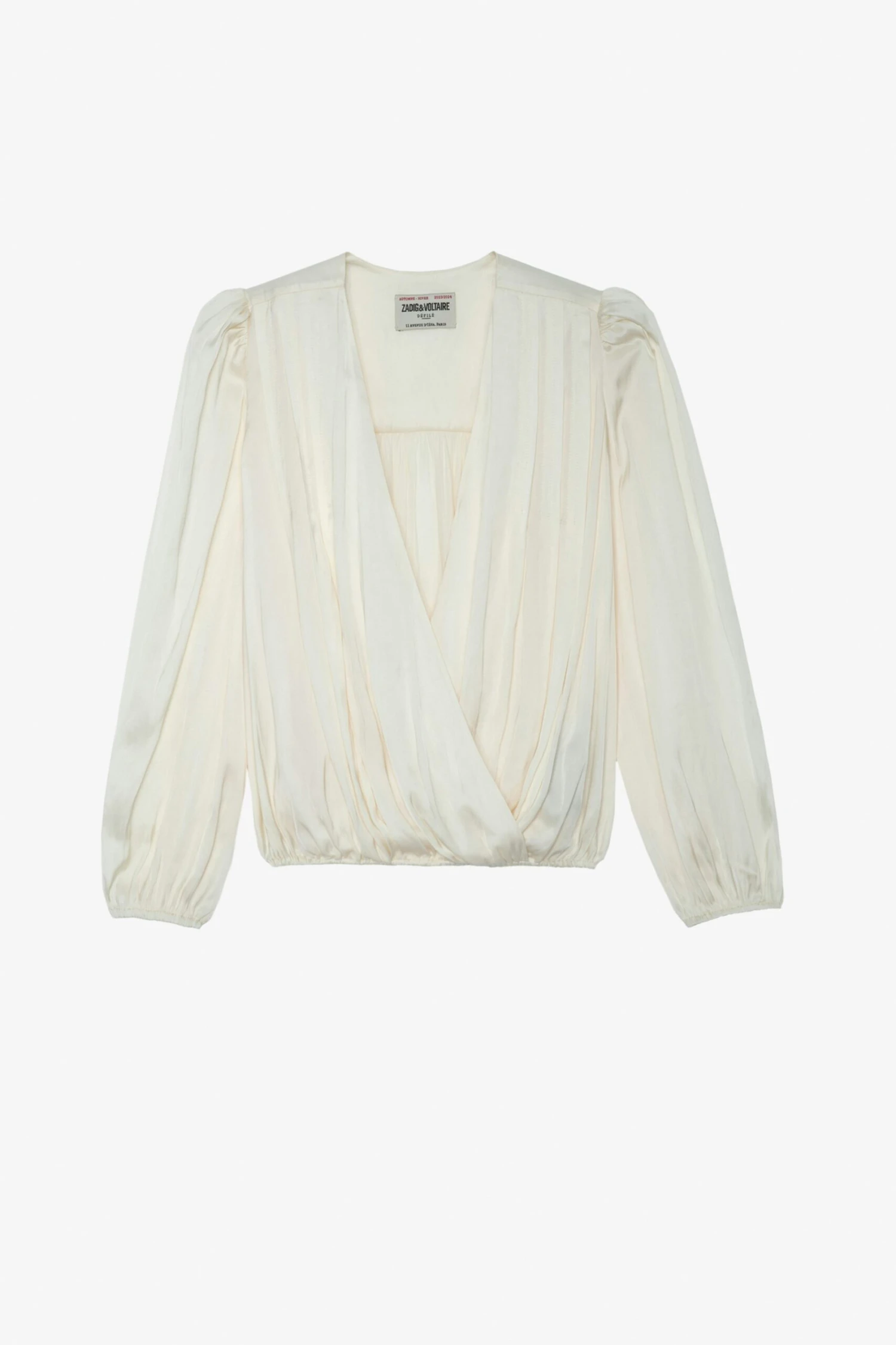 Ecru draped satin cropped top with wrap neckline and 3u002F4-length sleeves.