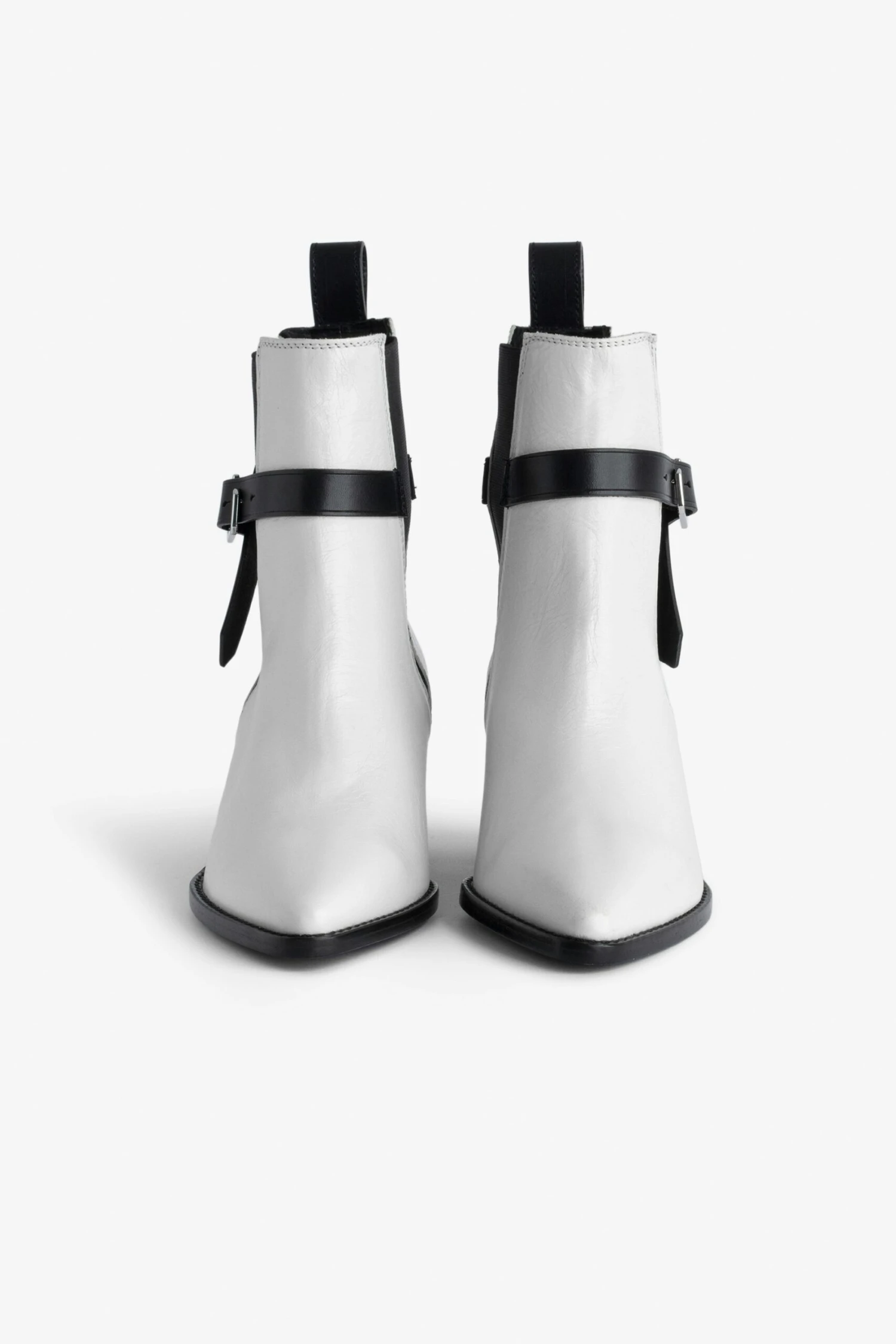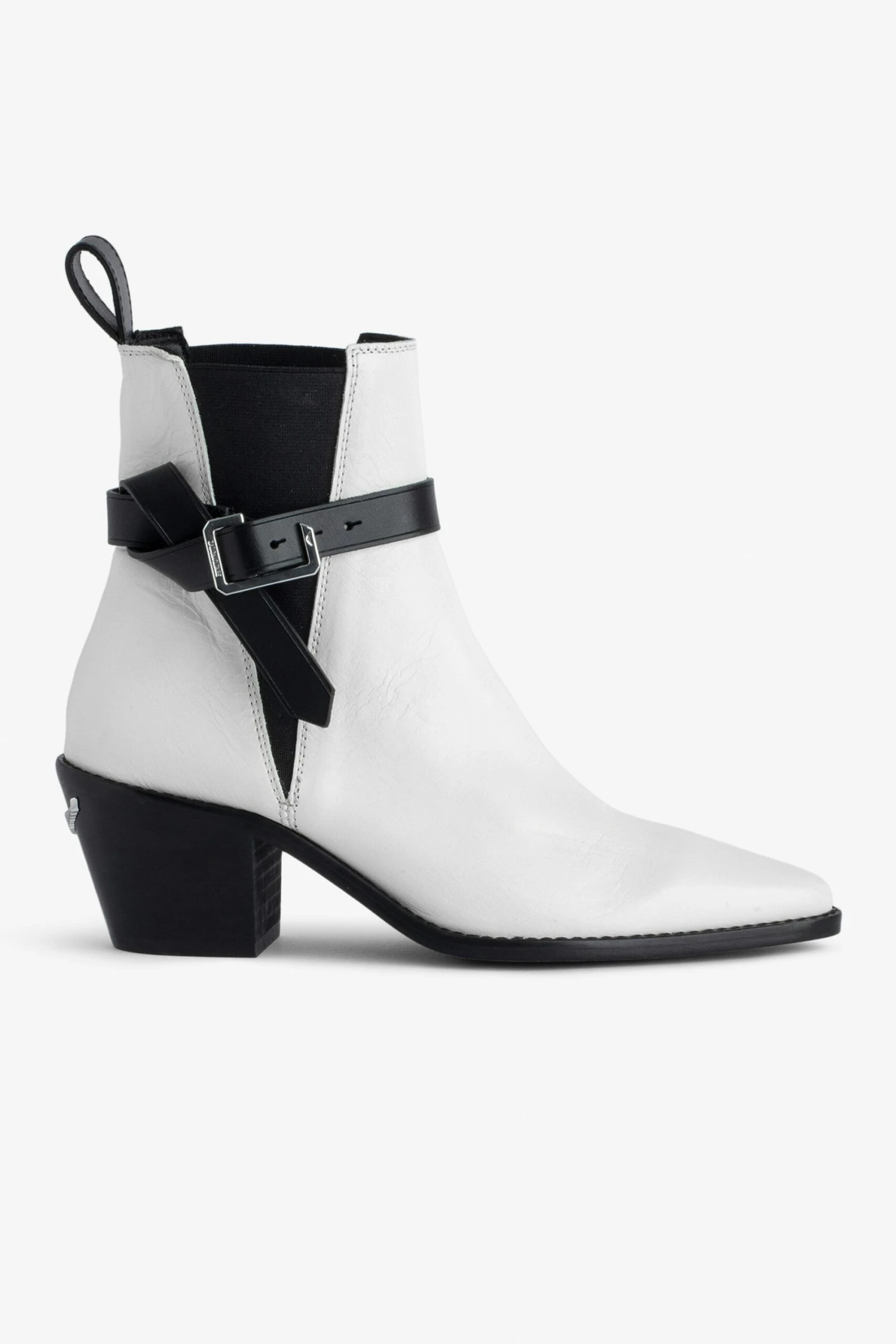 Women’s white vintage-style leather ankle boots with C buckle.n