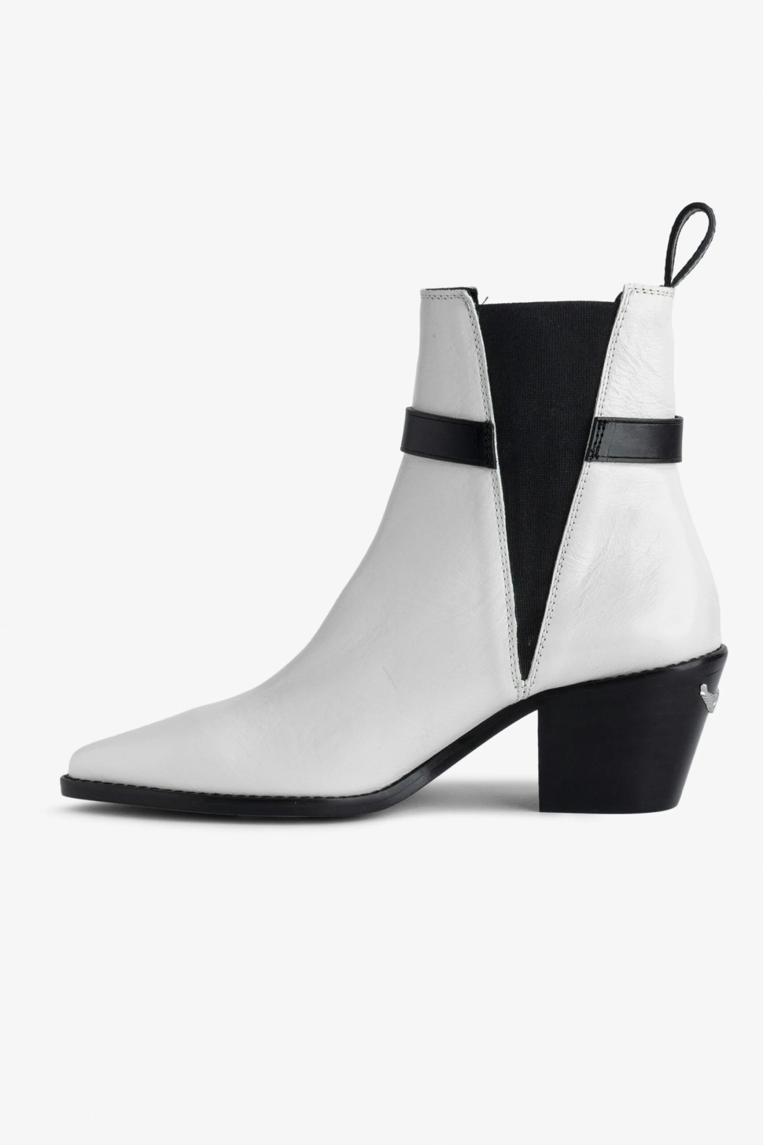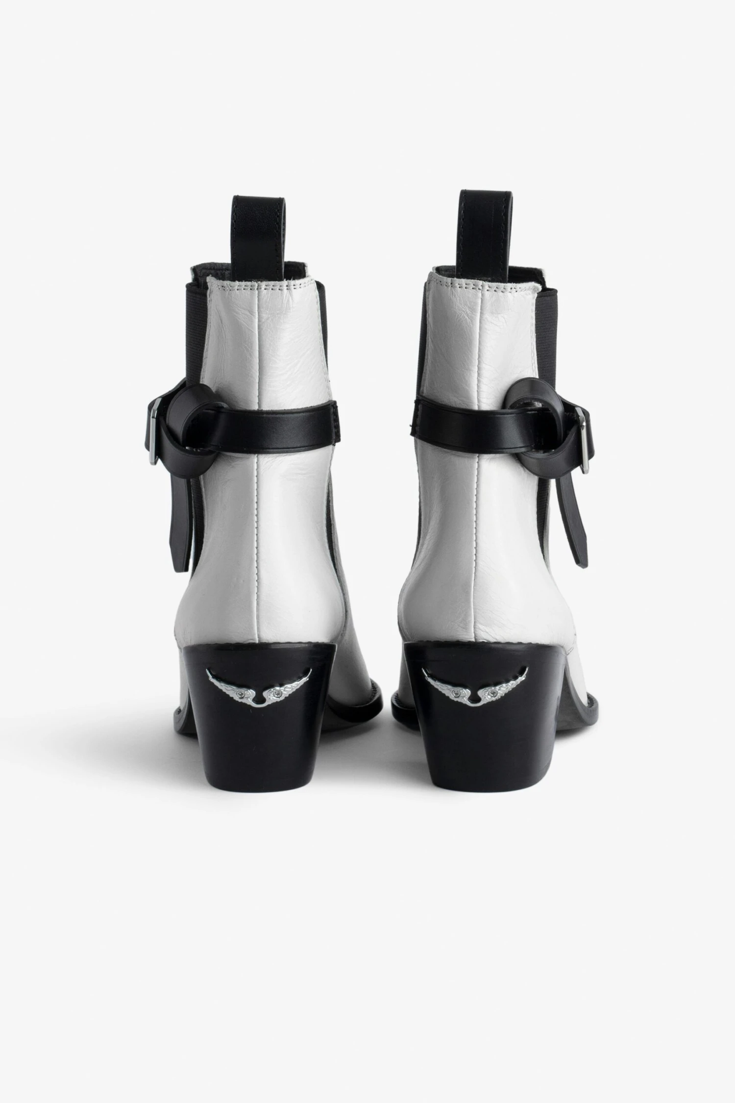 – Women’s white vintage-effect leather ankle boots – Adjustable strap with metal C buckle – Back tab and elasticated sides – Bevelled heels with wings charm – Heel height: 2.8 in – Made in Spain The Leather Working Group/LWG is a membership organization comprised of brands, suppliers, leather manufacturers and other stakeholders within the leather manufacturing industry. The group has developed an auditing program which certifies leather manufacturing facilities based on their environmental compliance and performance capabilities