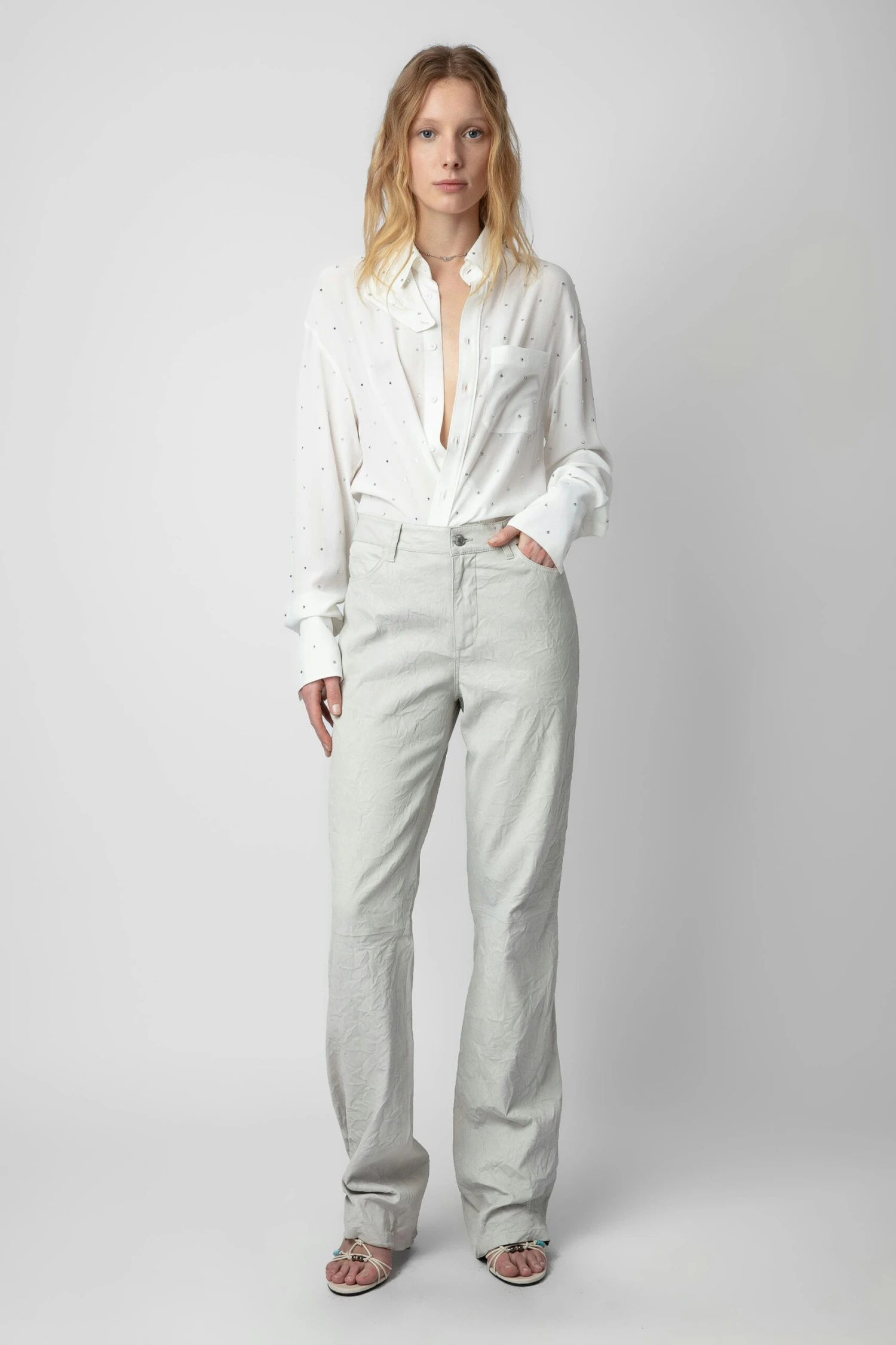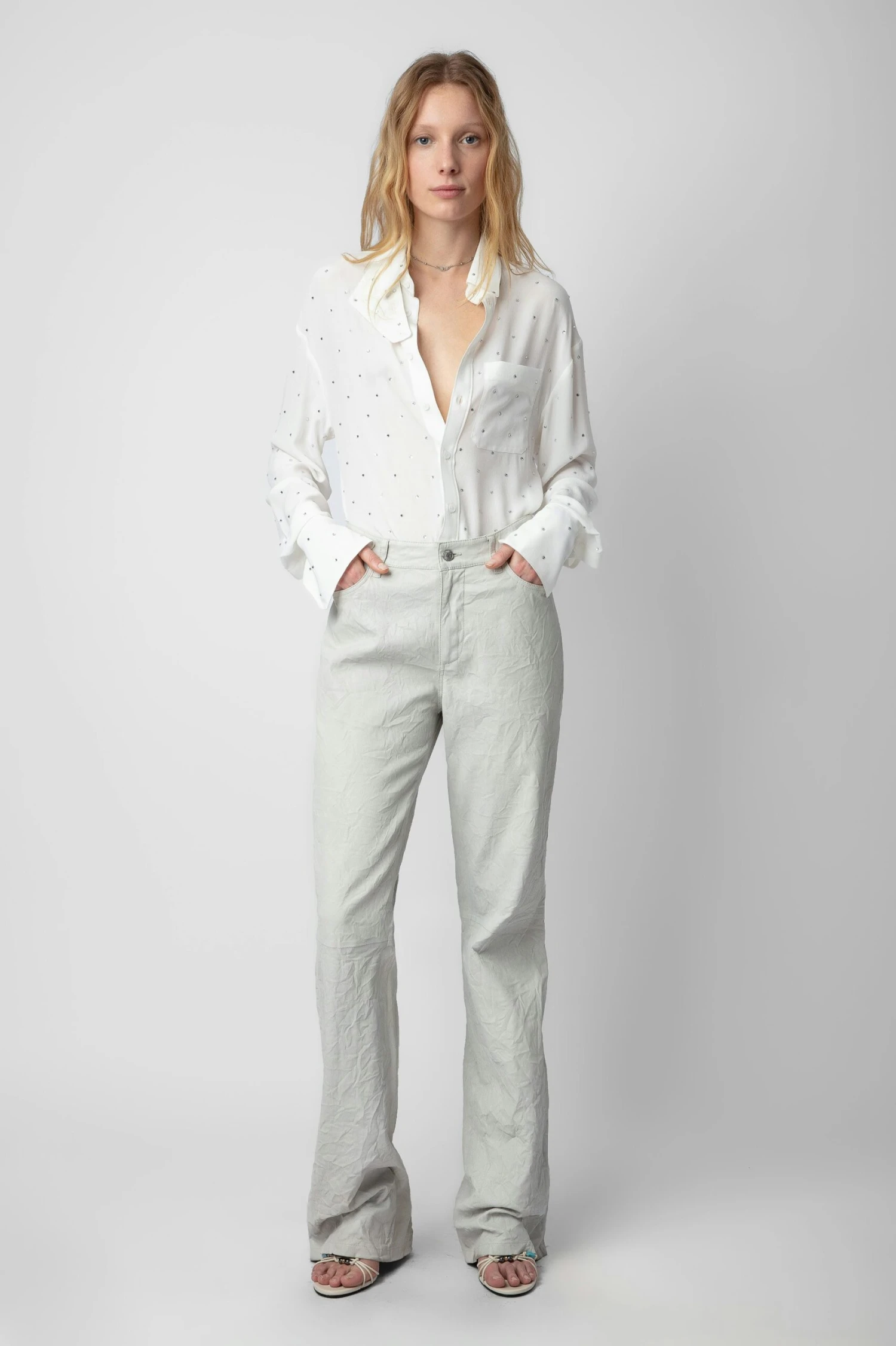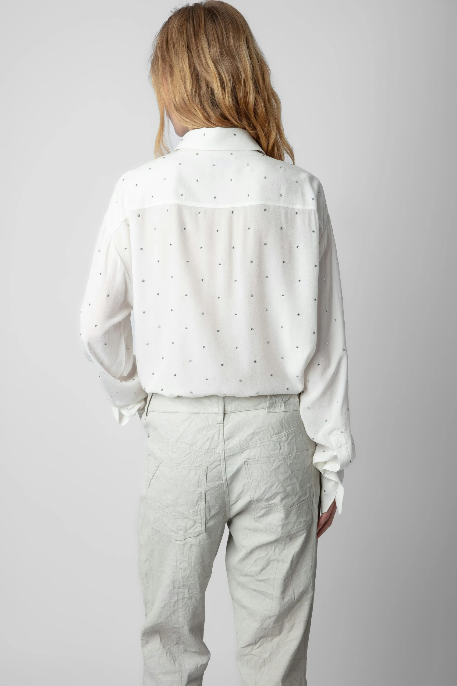 – Women’s white silk button down shirt – All over diamanté – Long sleeves with buttoned cuffs – Straight hemline – Breast pocket – Detachable tab at collar Model is 174 cm / 5′ 8″ and is wearing a size S