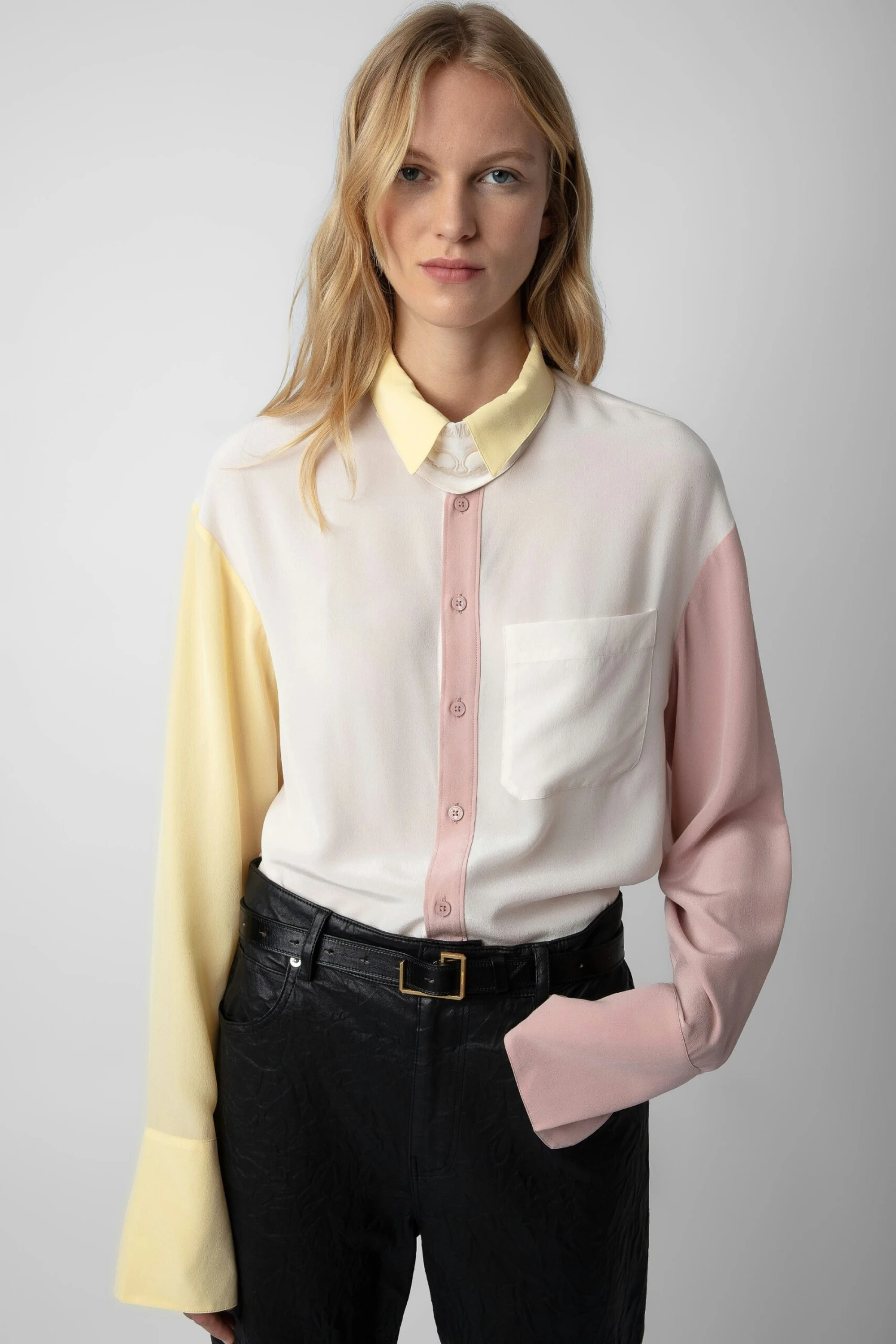 Women’s colorblocked silk shirt with detachable tab at collar.