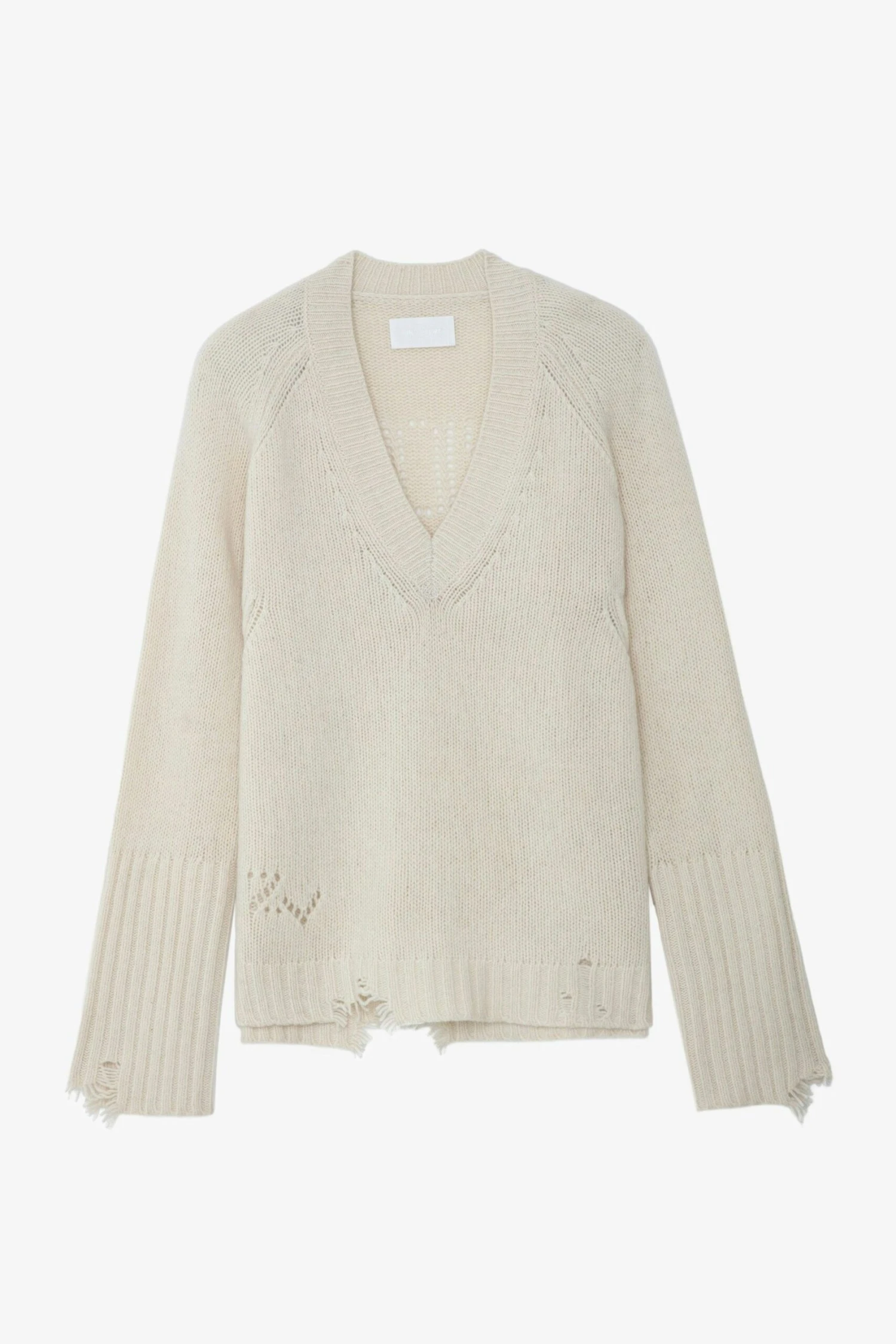 – Women’s white merino sweater – V neckline – Long sleeves – Distressing on sleeves and hem – Pointelle “AMOUR” detail on back and ZV logo on hem Model is 174 cm / 5′ 8″ and is wearing a size S*Contains 100% RWS certified woolThe Responsible Wool Standard (RWS) guarantees animal welfare and respect for pastures. It also ensures end-to-end traceability of the wool through the supply chain