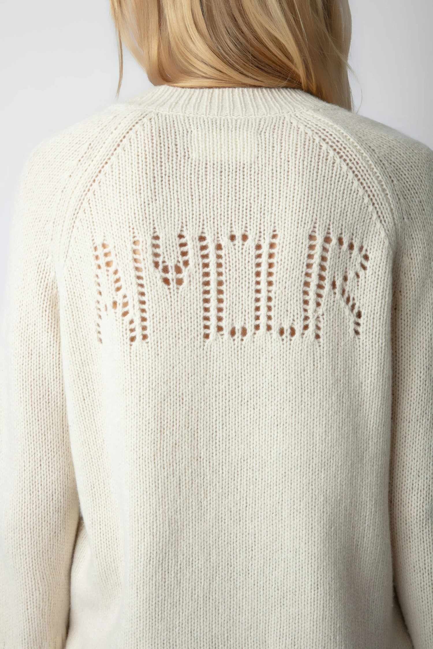 Women’s white merino wool sweater with pointelle “AMOUR” detail on back.