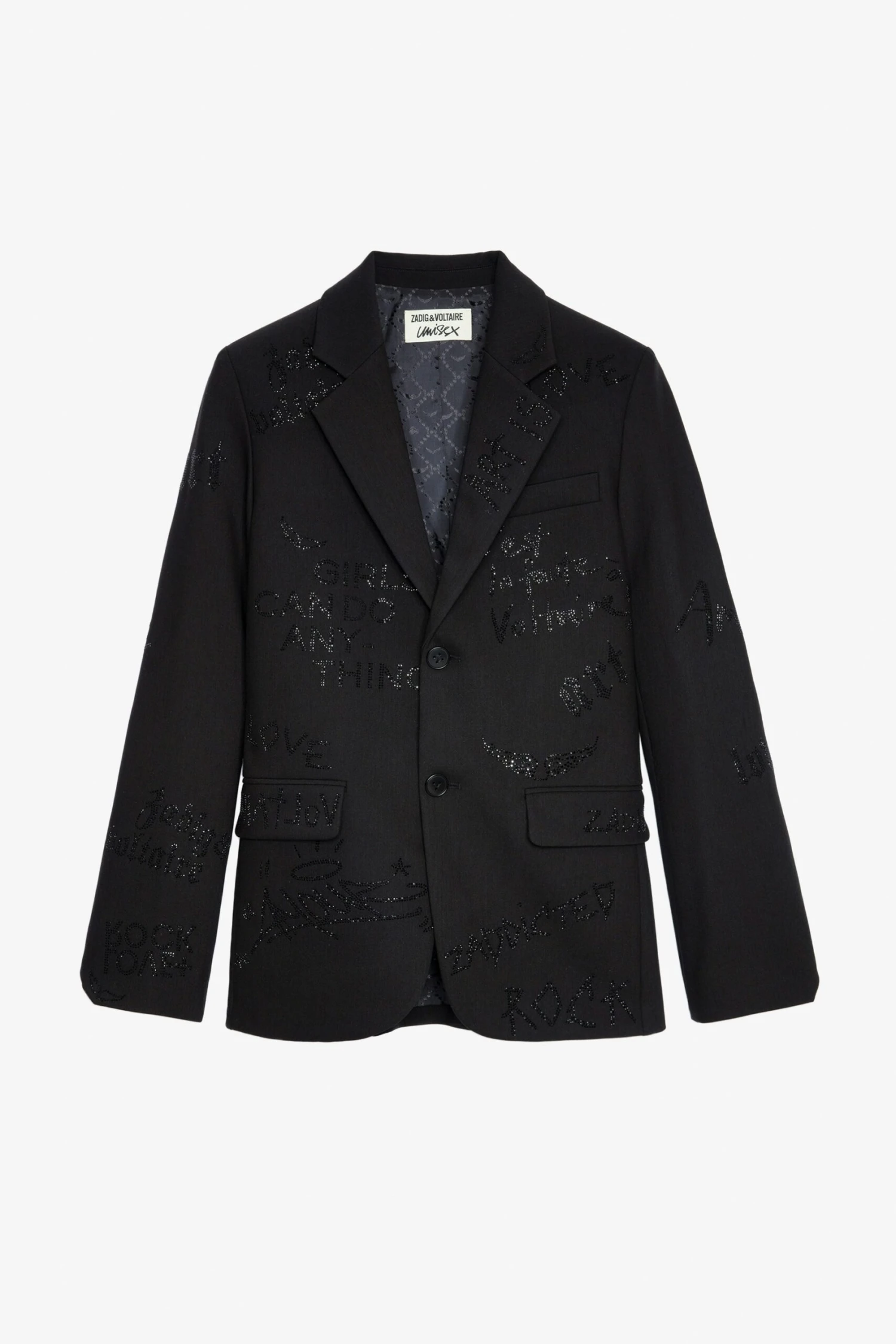Unisex black blazer with diamanté manifesto.