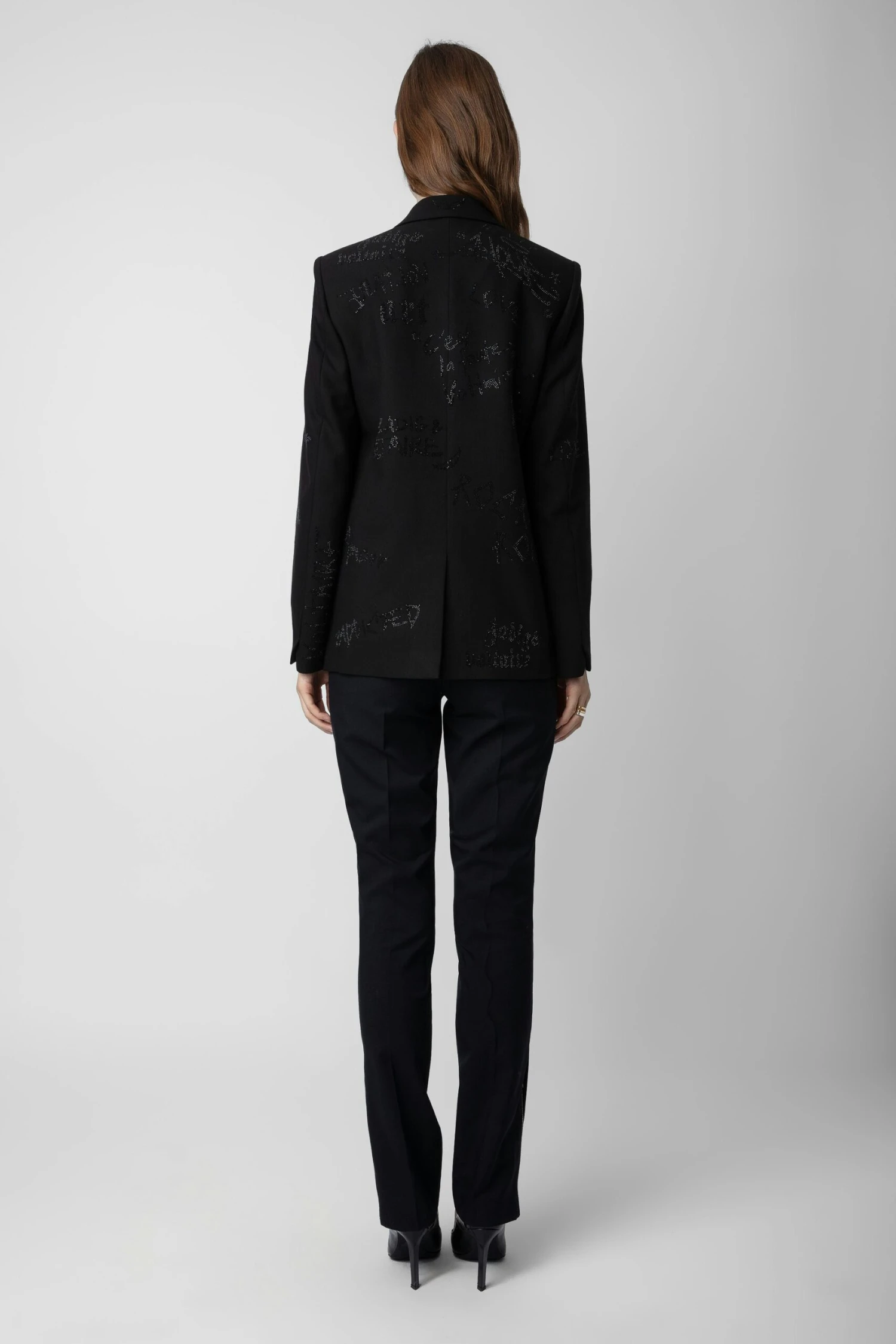 – Unisex black structured blazer – Masculine cut – Diamanté-embellished Zadig&Voltaire manifesto – Tailored collar and double-breasted fastening – Piped chest pocket and 2 flap pockets – Long sleeves and slit at back Model is 170 cm / 5′ 6″ and is wearing a size S