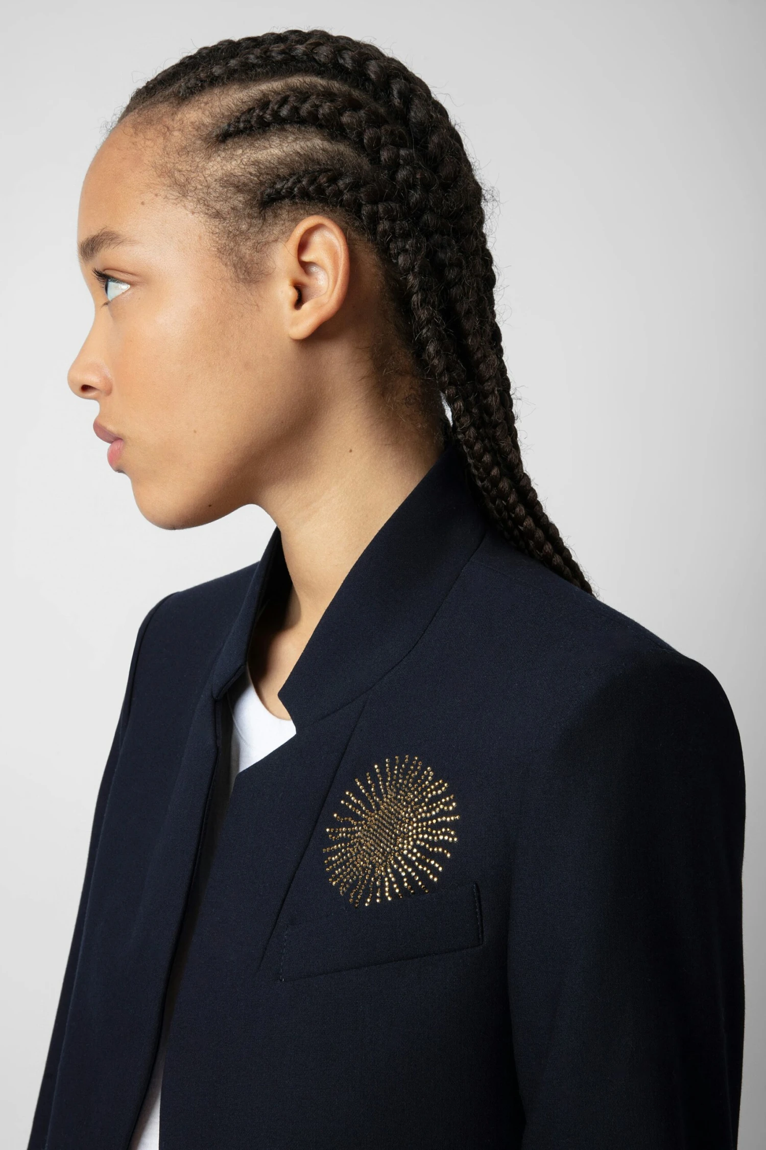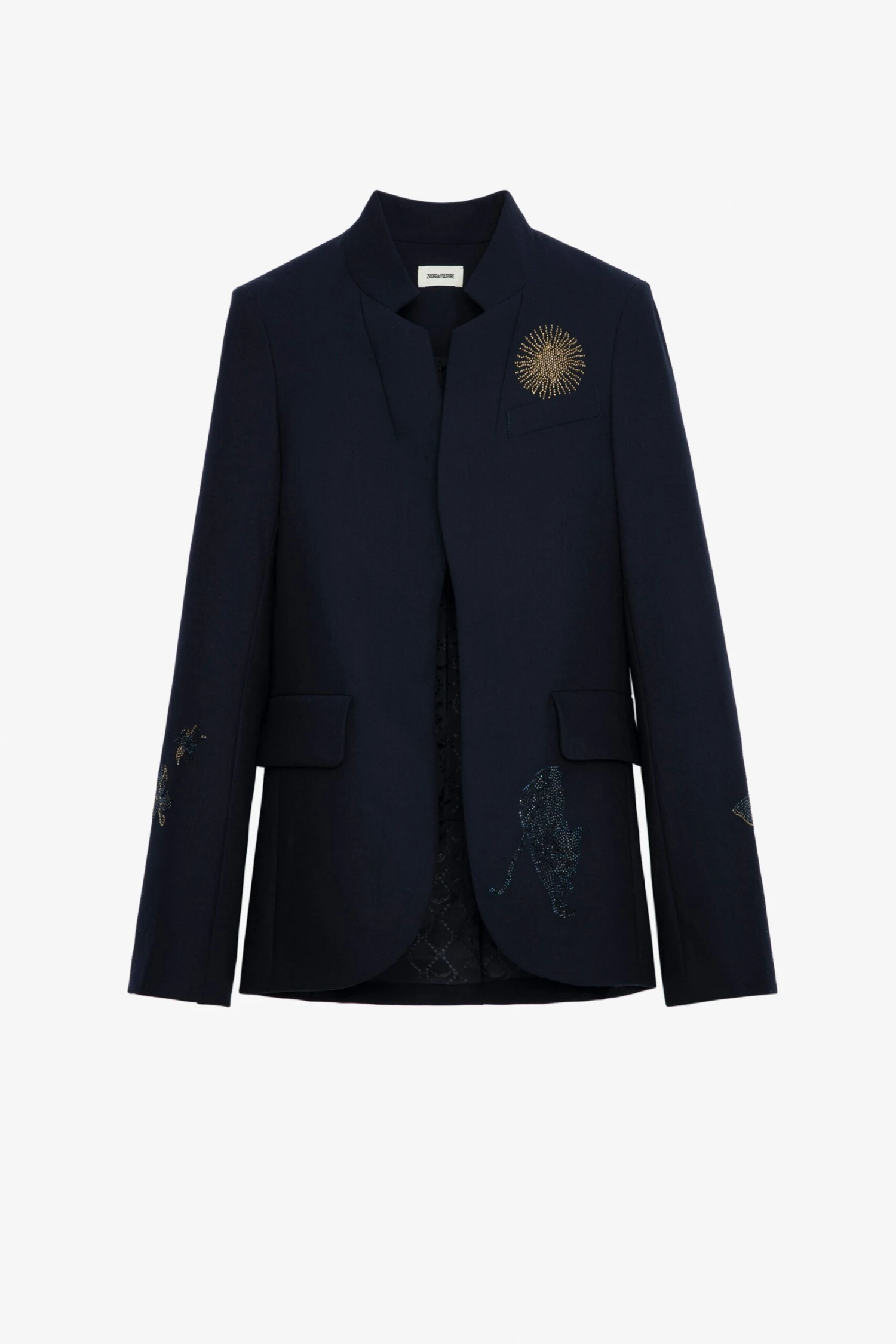 – Women’s navy blazer with strass details – Buttonless blazer – Collar with dart – Crystal embellished sun, bird, and butterfly featured throughout