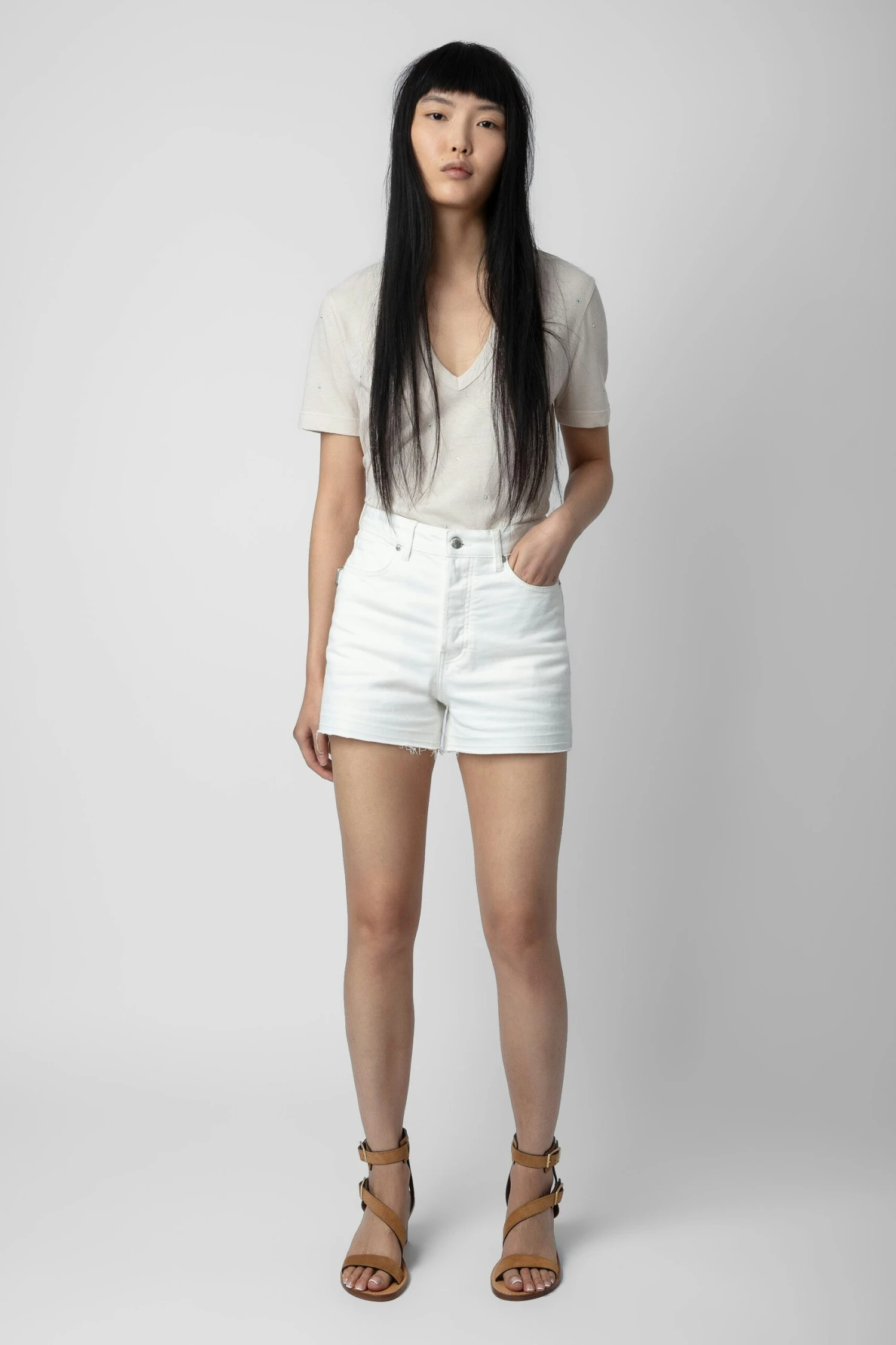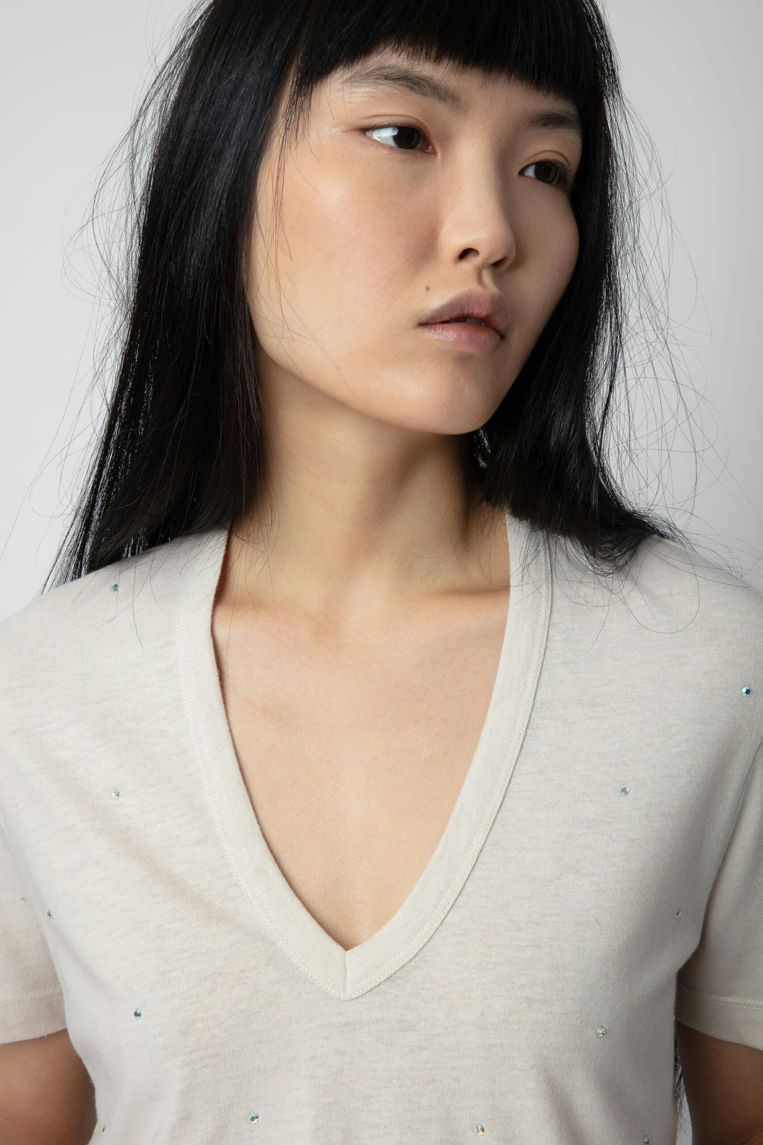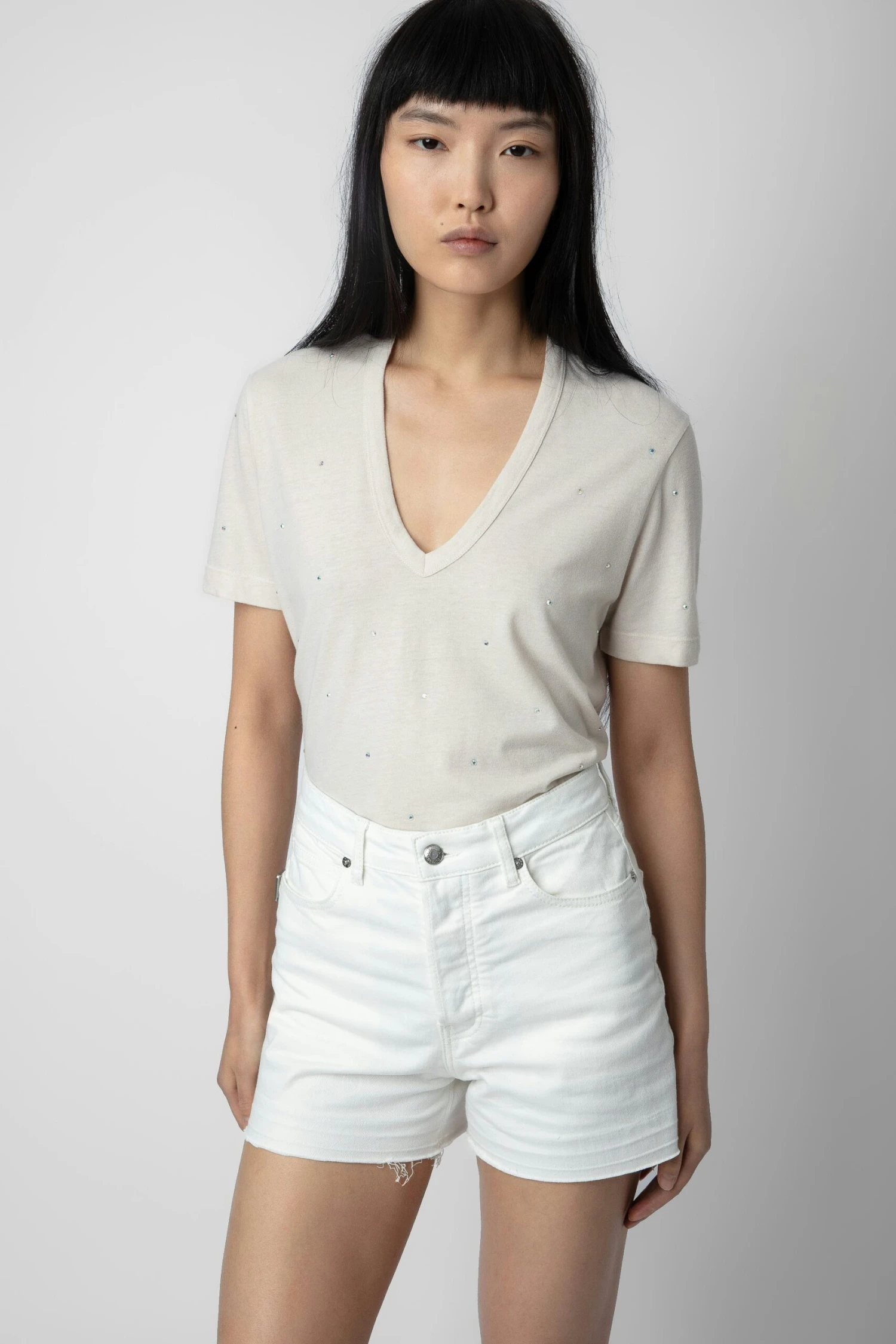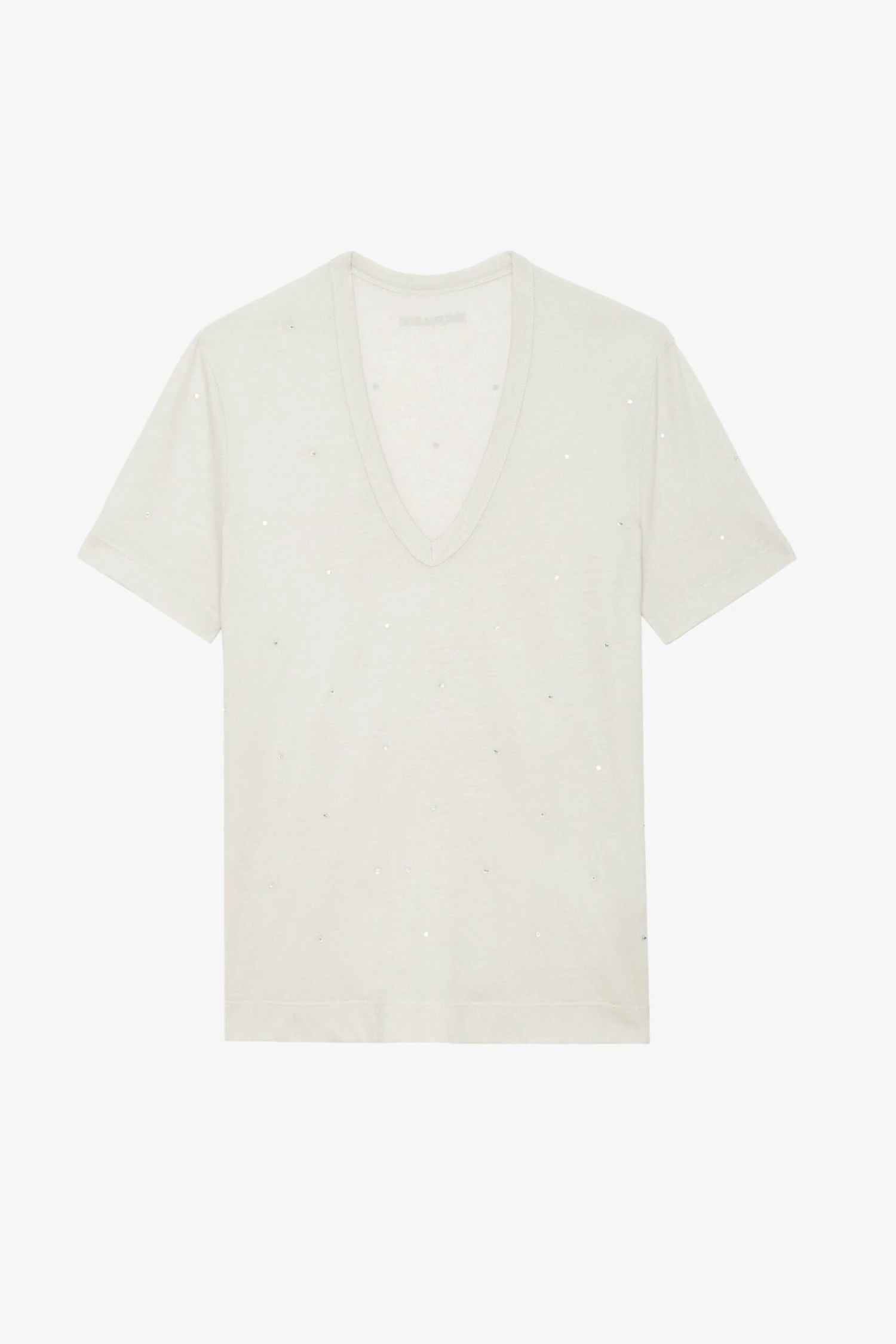 Light pink short-sleeved T-shirt with V neckline and diamanté.