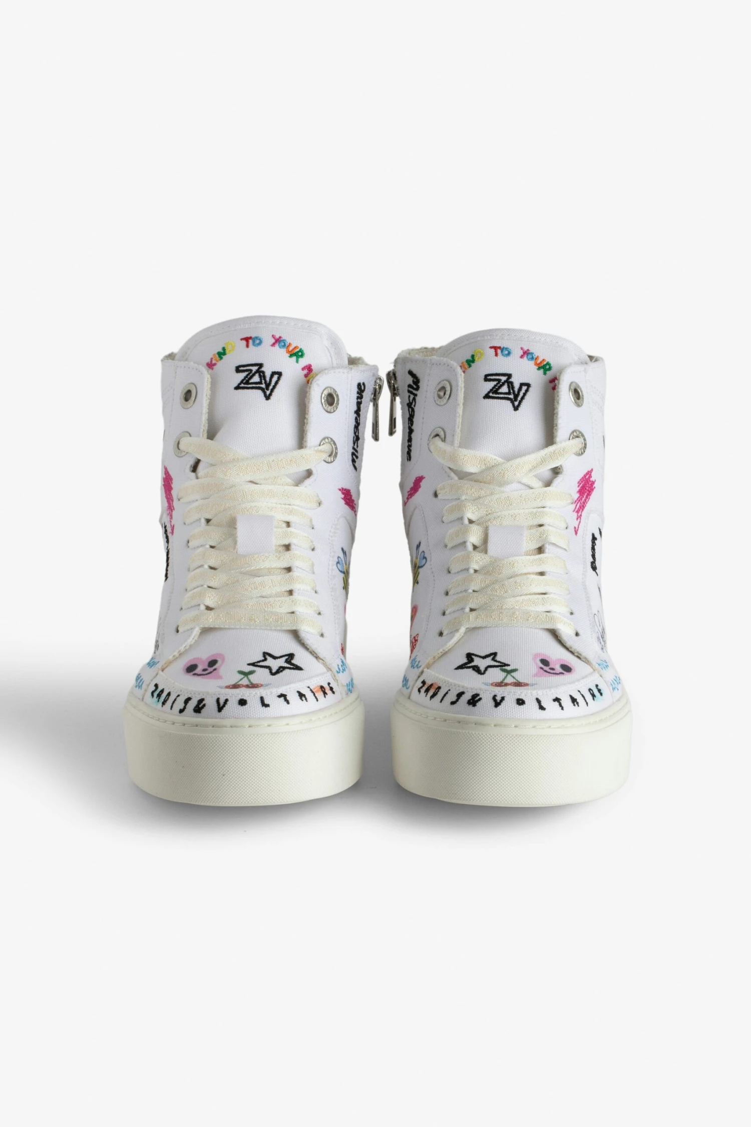Customized details designed by Humberto Cruz, an artist and illustrator from San Diego. Influenced by pop culture, fashion and colors, he describes his work as spontaneous and quirky. – Women’s white canvas high-top trainers with laces and zip – Lightning overstitching – Chunky wedge insole: 2.7 cm – Made in Portugal **Fibers from organic farming