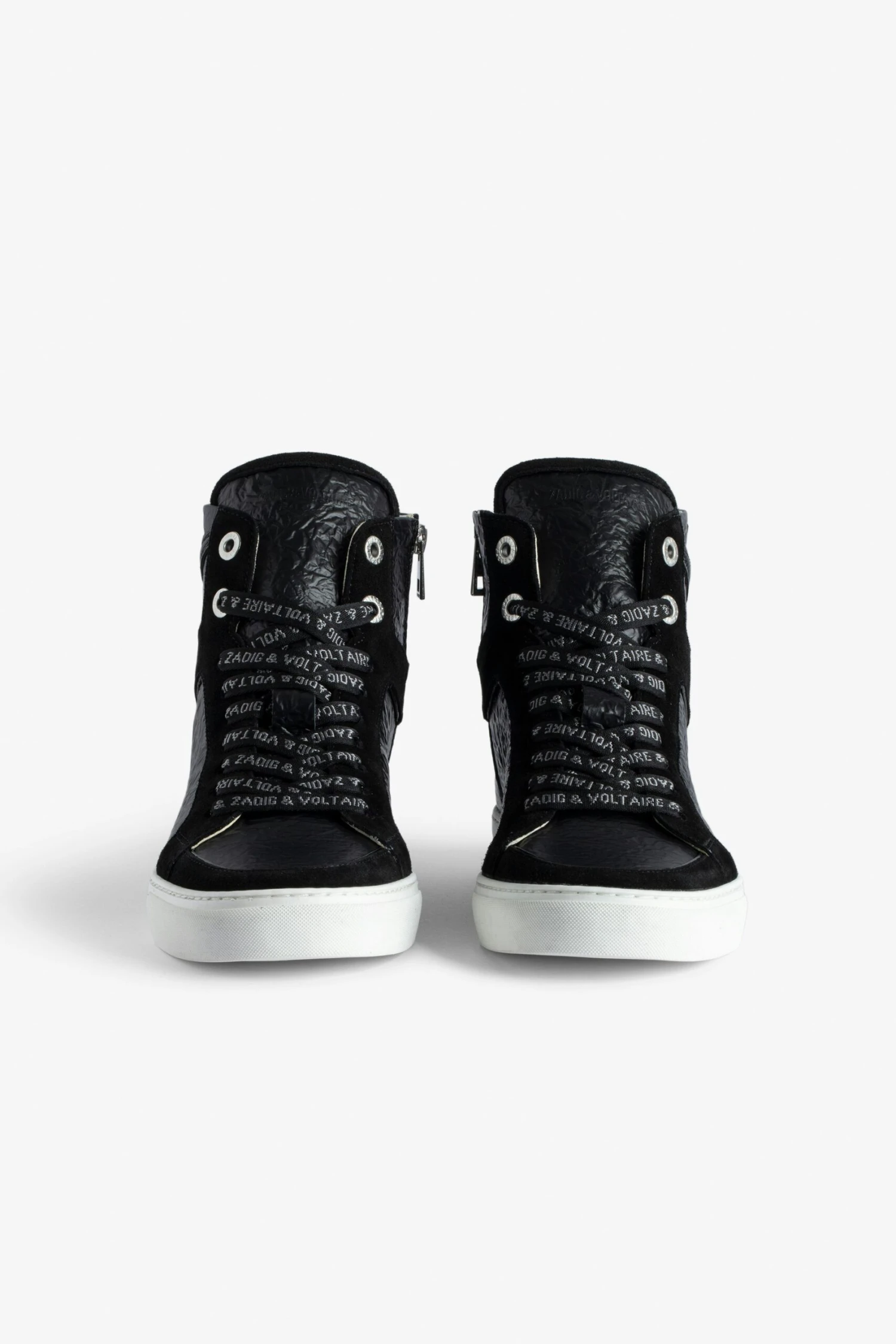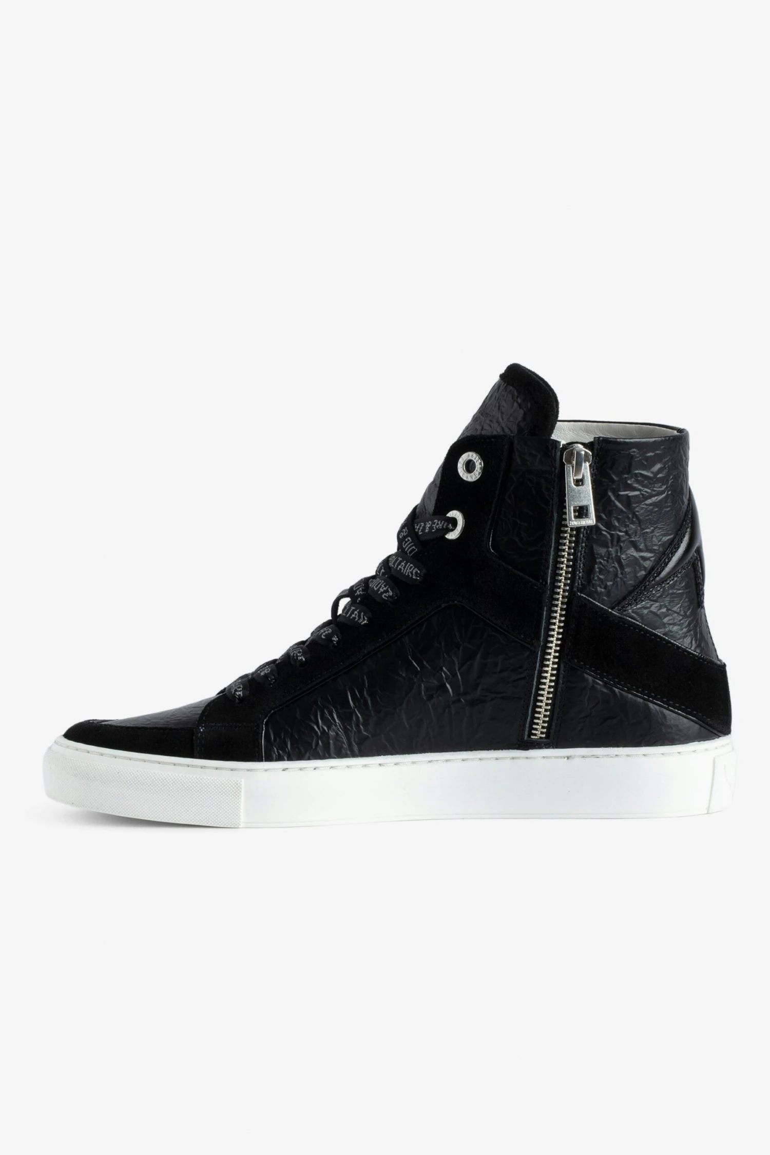 – Women’s black high-top sneakers with laces and zip – Mix of distressed leather and suede panel – Smooth leather lightning bolt panel and Zadig&Voltaire branded laces – Wedge insole – Made in Portugal The Leather Working Group/LWG is a membership organization comprised of brands, suppliers, leather manufacturers and other stakeholders within the leather manufacturing industry. The group has developed an auditing program which certifies leather manufacturing facilities based on their environmental compliance and performance capabilities