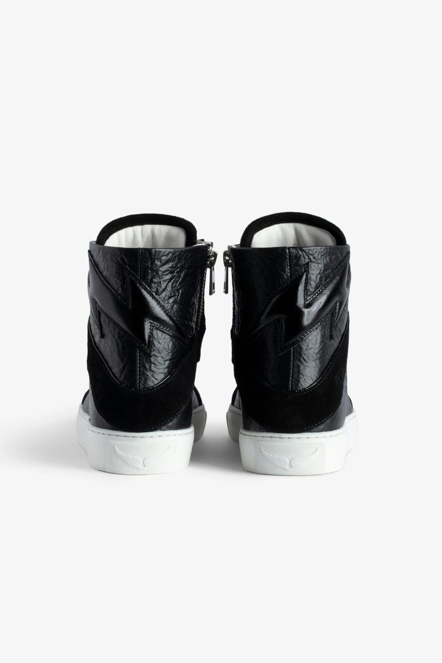 Women’s black distressed leather high-top sneakers with lightning bolt and suede panels.