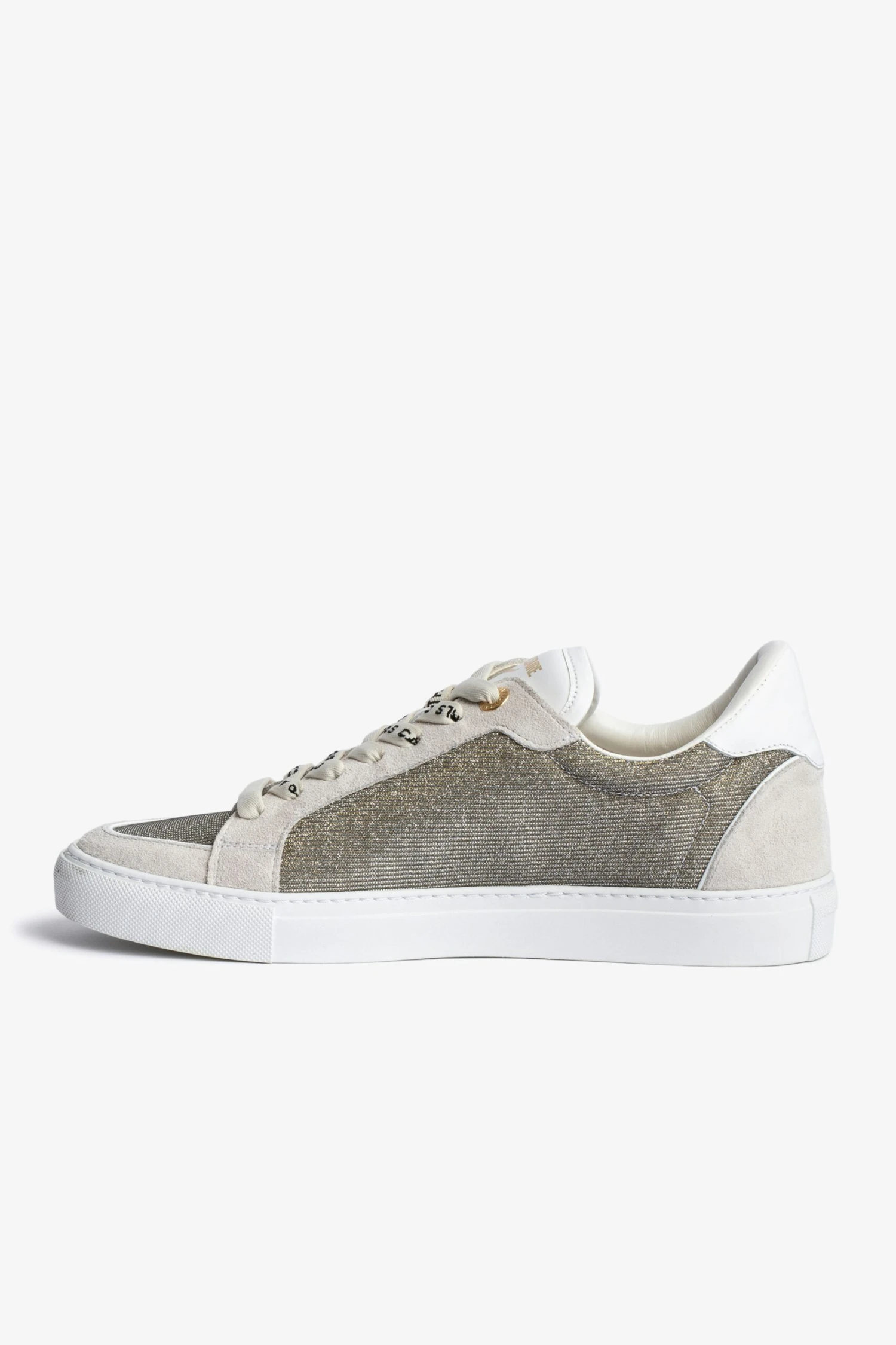 The brand’s iconic ZV1747 sneakers are available this season in smooth white suede, embellished with glittery fabric tabs, lightning bolt patches and “Girls Can Do Anything” laces. – Zadig&Voltaire women’s ZV1747 low-top sneakers in white leather and glittery fabric – Girls can do anything laces – Lightning bolt topstitching – Suede tabs – Made in Portugal.